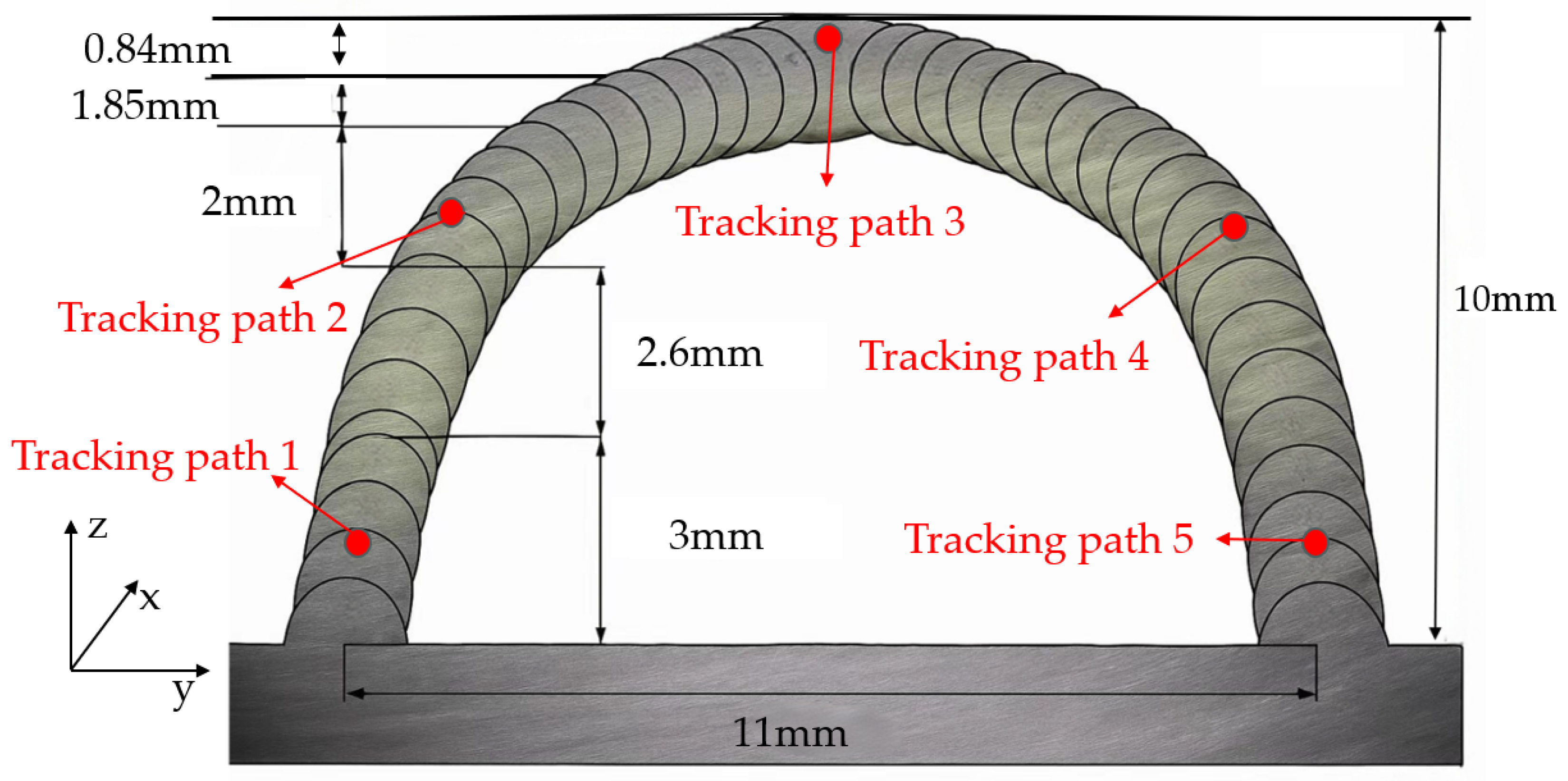 - Wang, X.; Williams, S.; Ding, J.; Dirisu, M.; Colegrove, P.; Rashid, M. The effect of torch position on the geometry of unsupported structures in wire and arc additive manufacturing. J. Manuf. Process. 2022, 84, 144–156. [Google Scholar]