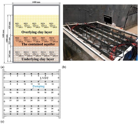 According to the geological and hydro-geological background in Shanghai, the soil layers from the top downward are brown-yellow clay layer, silty clay layer, silt sand layer, clayey soil layer and silt sand layer []. The silty clay of layer No. 4 and the silty sand was used to simulate the clay layer and confined aquifer, respectively. The physical and mechanical parameters of soils for the model are summarized in Table 1. As shown in Figure 1, the experimental device mainly consists of a model box, a layered water level control tank, a groundwater pumping device, a data measurement system, and data acquisition equipment. The model box, as shown in Figure 2a, is the main area for testing, with dimensions of 1000 mm × 900 mm × 1400 mm in width, length, and height, consisting of an uncovered metal plate box, tempered glass, and a methyl methacrylate upper cover. The uncovered box is composed of metal plates with holes on the left and right sides and tempered glass plates at the front and rear. The holes on the metal plates are water holes for boundary replenishment after water pumping. The use of tempered glass on the front and rear surfaces of the model box is to measure the internal displacement of the soil using PIV during the testing process. Twelve pore water pressure transducers (PPT) and earth pressure cells (EPC) were used for each type, with four arranged in the middle of each layer of soil, as shown in Figure 2b. A total of 41 LVDTs were used, and Figure 2b,c, respectively, show the composition framework and arrangement of the LVDT.