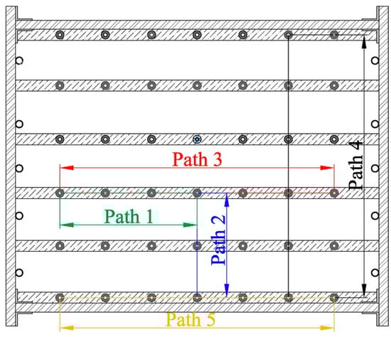 After the soil consolidating, the peristaltic pump with a controllable flow rate was used for three pumping operations, with pumping volumes of 3 L, 6 L, and 9 L, respectively. The pumping rate during the three pumping operations was approximately 100 mL/min. Paths 1~4 were selected for analysis of different spatial positions, as shown in Figure 3.