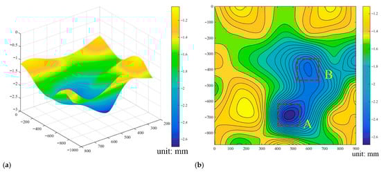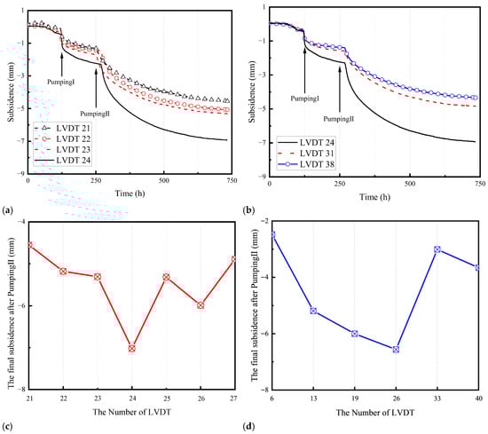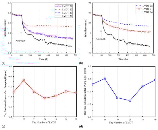 As shown in Figure 5a, land subsidence caused by Pumping III exceeded 50% of the final value between the 100th and 200th hour. LVDTs No. 21–24 recorded subsidence values of −1.29 mm, −0.68 mm, −0.86 mm, and −1.65 mm, respectively. By the 200th hour, the subsidence had reached −0.92 mm, −0.65 mm, −0.86 mm, and −1.07 mm, corresponding to 71.2%, 94.3%, 68.8%, and 64.6% of their final values. This indicates that the subsidence induced by Pumping III was significantly smaller than that observed during the previous two pumping operations. The spatial distribution pattern shown in Figure 5b is similar to that in Figure 4b. Figure 5c,d show the final subsidence recorded by the LVDTs at each monitoring point along Path 3 and Path 4 after Pumping III. Along Path 3, LVDTs No. 21−27 measured subsidence values of −1.29 mm, −0.69 mm, −1.25 mm, −1.58 mm, −1.46 mm, −1.24 mm, and −1.29 mm, respectively.