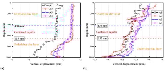 As shown in Figure 9a, for the first two pumping, the four curves from A1 to A4 have maximum cumulative settlement values of −4.73 mm, −3.73 mm, −3.56 mm, and −3.37 mm. The corresponding upper layer soft clay compression amounts are 1.27 mm, 1.29 mm, 1.00 mm, and 0.77 mm, accounting for 27.2%, 34.4%, 28.0%, and 22.7% of the maximum settlement, respectively. The lower layer soft clay soil compression accounts for a considerable proportion of 73.0%, 66.1%, 71.3%, and 75.6%, respectively. In the soil compression caused by Pumping I and Pumping II of 9L, the compression amount of the underlying clay layer was significantly greater than that of the overlying clay layer.