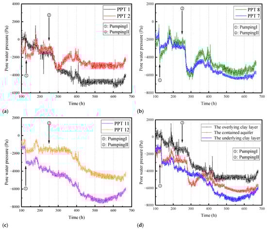 Figure 10 illustrates the variation in pore pressure with time in different soil layers caused by the first and second pumping, as well as the comparison of pore pressure in different soil layers. Figure 10a–c represents the pore pressure data collected by piezometers at different distances from the pumping well in the same soil layer. There were differences in the measured pore pressure between the overlying and underlying clay layers at different distances from the pumping well, while the pore pressure values measured by the piezometers at different distances from the pumping well in the middle sand layer were very close. In the overlying clay layer, the pore pressure difference at different positions is relatively small before Pumping II. However, as Pumping II was completed, the difference in pore pressure between the two positions also increased. For the middle sand layer, the influence of pumping on the pore pressure difference at different positions is not significant. As for the underlying soft clay layer, the pore pressure difference between the two positions started to occur after Pumping I. The most probable cause of this phenomenon is that with the implementation of pumping, the soft clay layer undergoes a significant degree of consolidation, while the sand layer undergoes a lesser degree of consolidation. The greater the consolidation, the more pronounced the change in permeability coefficient, resulting in a significant difference in pore pressure distribution within the same soil layer. Although the overlying and underlying soft clay layers have similar soil properties, their different positions result in different consolidation pressures, leading to a significant difference in compaction degree between the two soil layers right from the beginning. The pore pressure difference within the overlying soft clay layer begins to appear only after experiencing two pumping events, while the underlying soft clay layer shows a pore pressure difference after Pumping I. As shown in Figure 10d, the change in soil compaction caused by precipitation, which then affects the permeability coefficient and finally results in uneven pore pressure distribution, was also reflected. In the overlying clay layer, whether it was the first or second pumping, the pore pressure changed rapidly. However, for the underlying clay layer, the pore pressure change is faster after Pumping I than that after Pumping II.