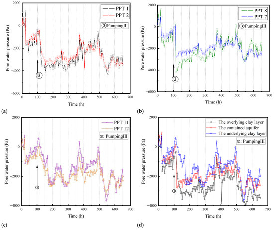 Three different soil layers were studied regarding the variation in pore pressure and its comparison after Pumping III, as shown in Figure 11. Figure 11a–c represent the pore pressure measurements obtained by pore pressure gauges placed at different distances from the pumping well within the same soil layer. The pore pressure measurements at different distances from the pumping well in the three soil layers show minimal differences, indicating the presence of a phenomenon where the pore pressure decreases and then rebounds. After Pumping III, the pore pressure in the overlying soft clay layer and the intermediate standard sand layer begins to decline rapidly. However, in the underlying soft clay layer, the pore pressure decrease caused by pumping is relatively gradual. Figure 11d illustrates that the pore pressure variations caused by PumpingⅢ exhibit similarities among the three soil layers, with no significant distinctions observed in terms of the rate or magnitude of change. This can be attributed to the potential formation of seepage channels within the soft clay layer or along the wellbore wall after multiple pumping events. As a result, the pore pressure changes are promptly transmitted among the different soil layers, leading to minimal discrepancies in the pore pressure variations observed across the three soil layers.