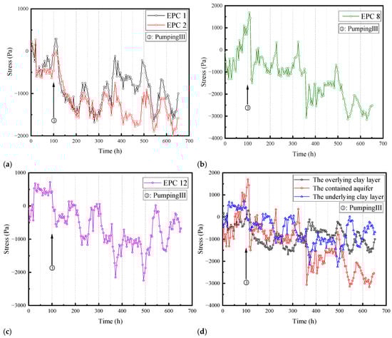 Select the EPC closest to the pumping well in each layer of soil to compare the changes in total stress in the three layers of soil, as shown in Figure 12d. Overall, the total stress changes in the overlying clay layer and confined aquifer are relatively similar, while the total stress development in the underlying soft clay layer is significantly different from these two layers. Pumping operations occurred in the confined aquifer, with the most significant total stress change in the three layers. Specifically, the total stress changed as soon as the pumping implementation, with a greater amplitude of the change than the other two layers. In the overlying and underlying clay layers, the effect of pumping on the total stress exhibits a lag effect, especially after Pumping II.