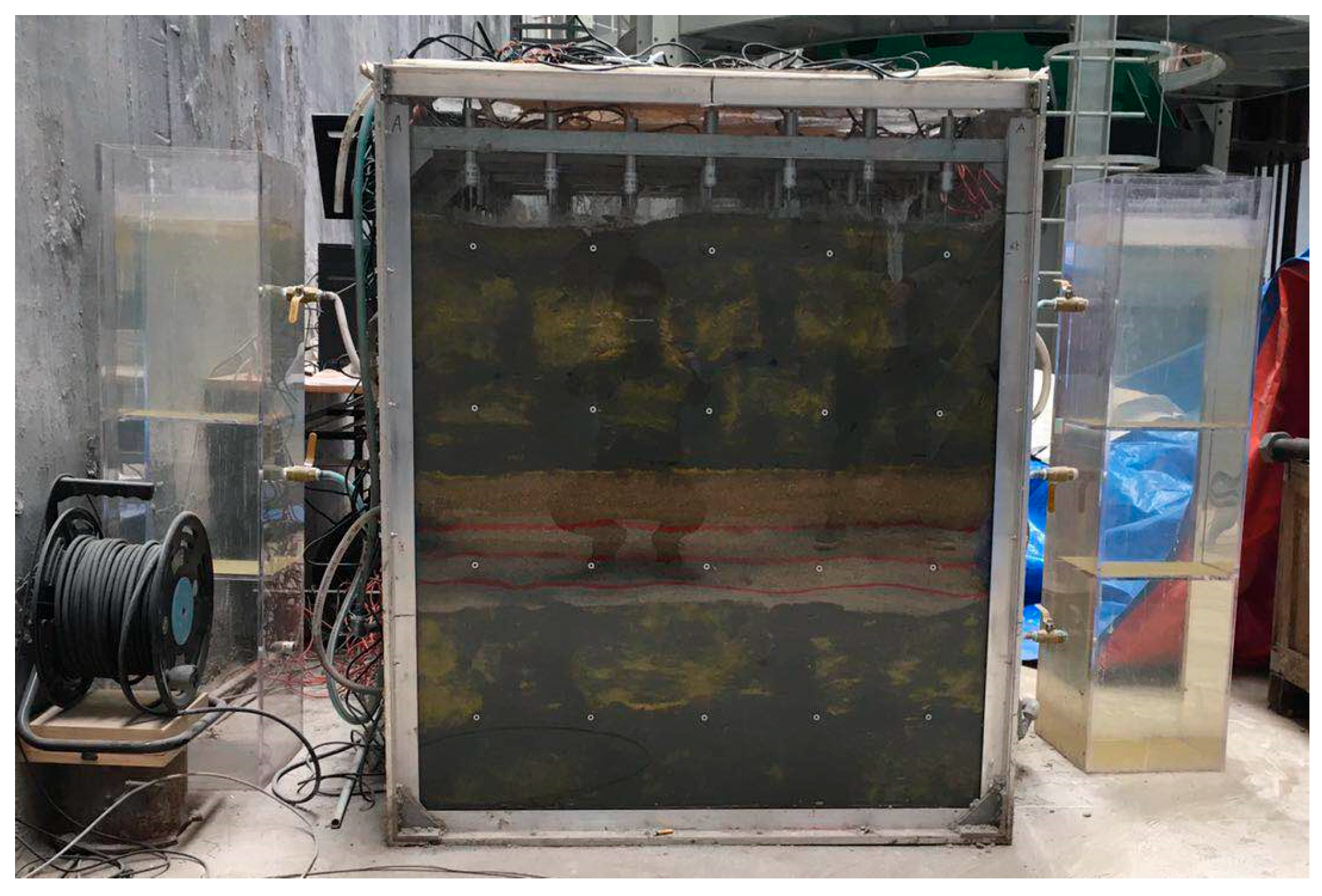 - The soil was consolidated and stabilized under self-weight conditions. To determine its stability, it was necessary to meet the requirements of stable values measured by the soil pressure cells, pore water pressure transducers, and linear displacement transformers;