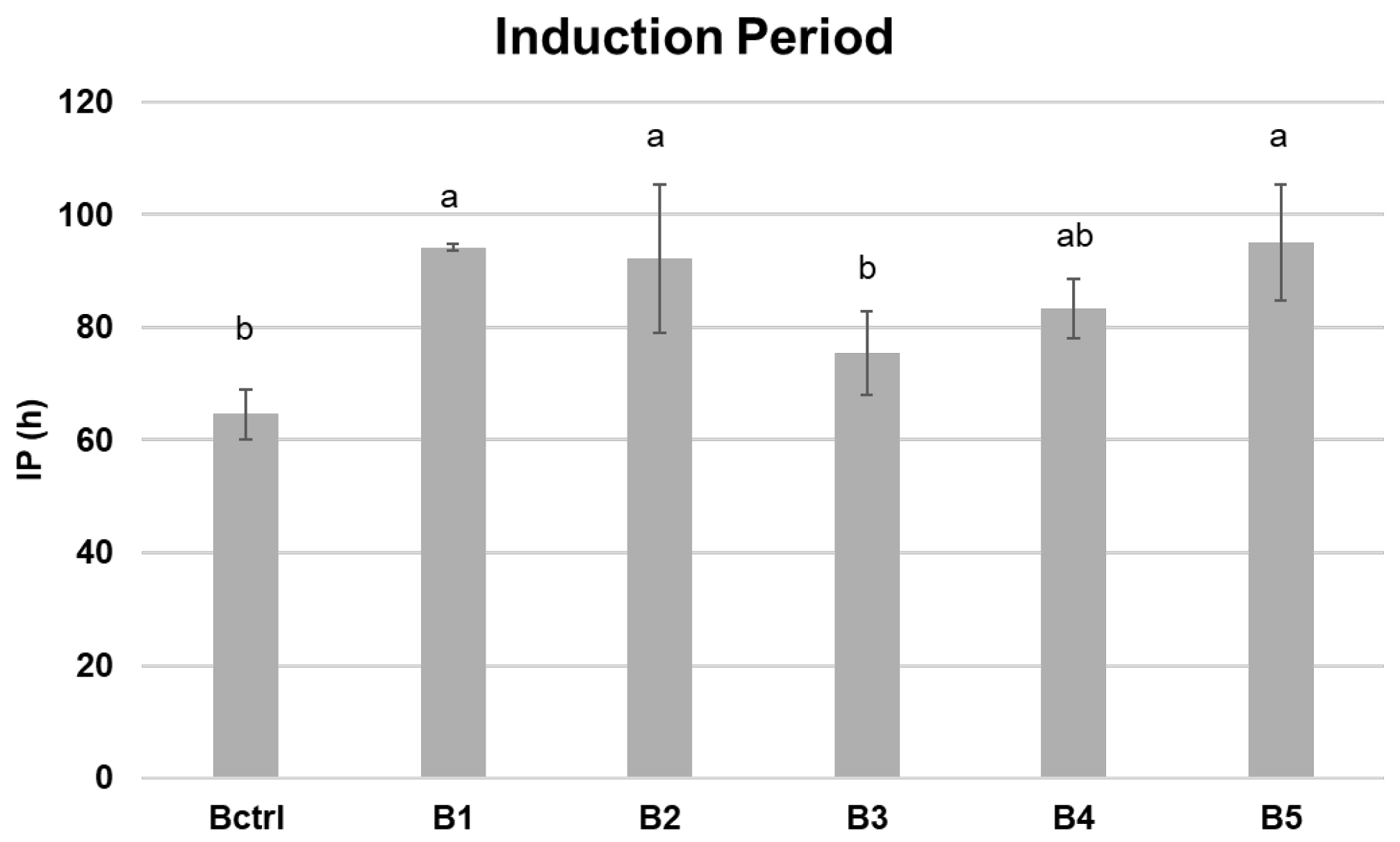 | PO | B | B:EVOO (50:50) | B:HOSO (50:50) | HOSO | CO:SO (87.5:12.5) | Bctrl (PO) | B1 (B) | B2 (B:EVOO) | B3 (B:HOSO) | B4 (HOSO) | B5 (CO: SO) | |