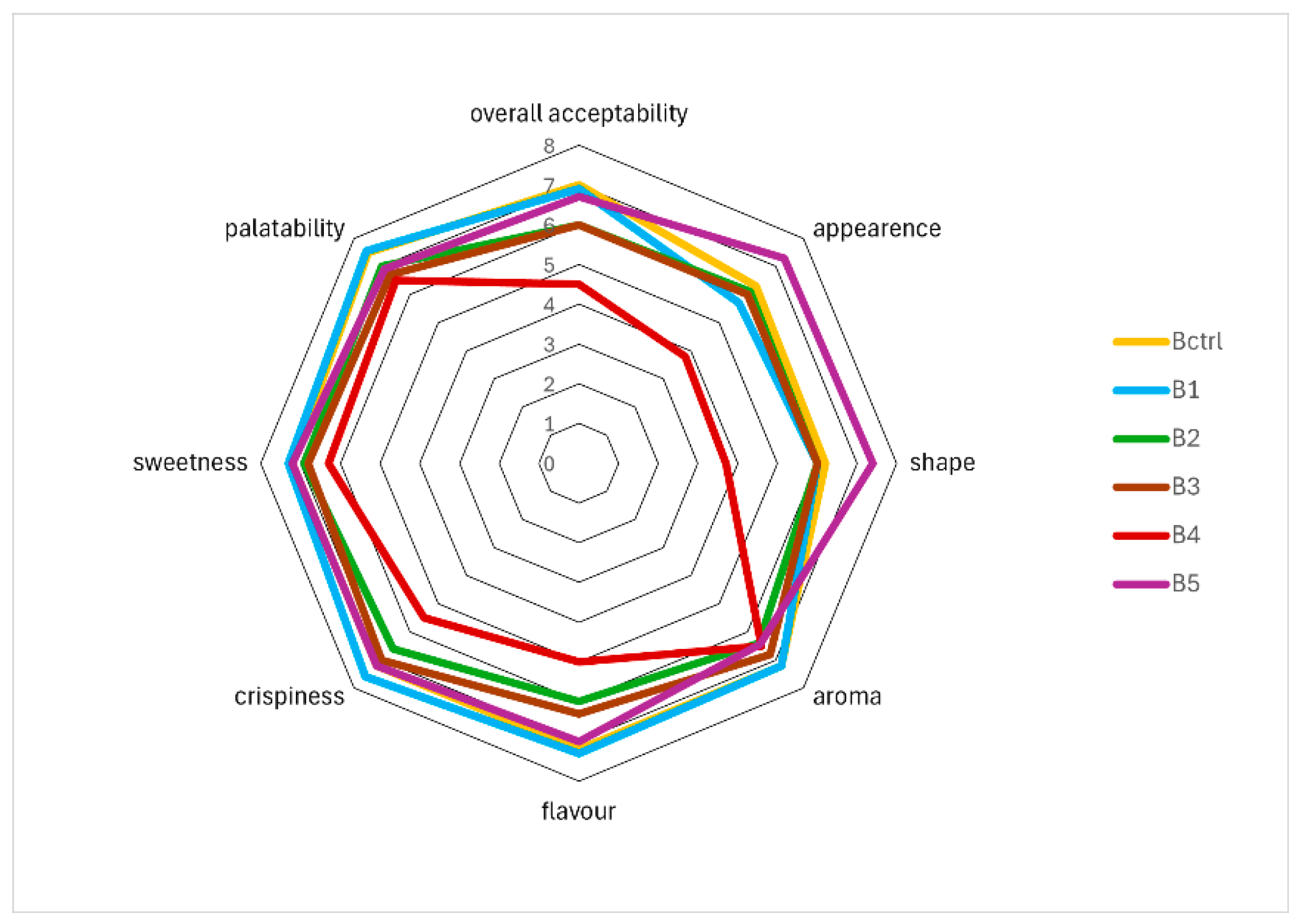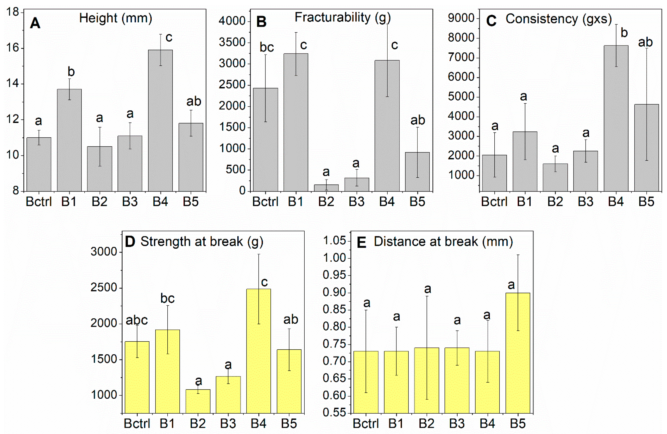 | Flavour | 5.00 b | 4.85 b | 4.35 a | 5.25 b | 4.85 b | 5.05 b |