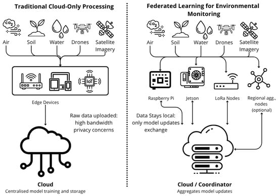 Conceptual architecture for environmental monitoring: comparison of traditional cloud-only pipelines (left) and federated learning (right). Sensors (air, soil, water, drones, satellite imagery) feed edge devices; in FL, local training occurs on-device, optional regional/fog aggregation supports hierarchical FL, and the coordinator aggregates model updates (no raw data sharing).