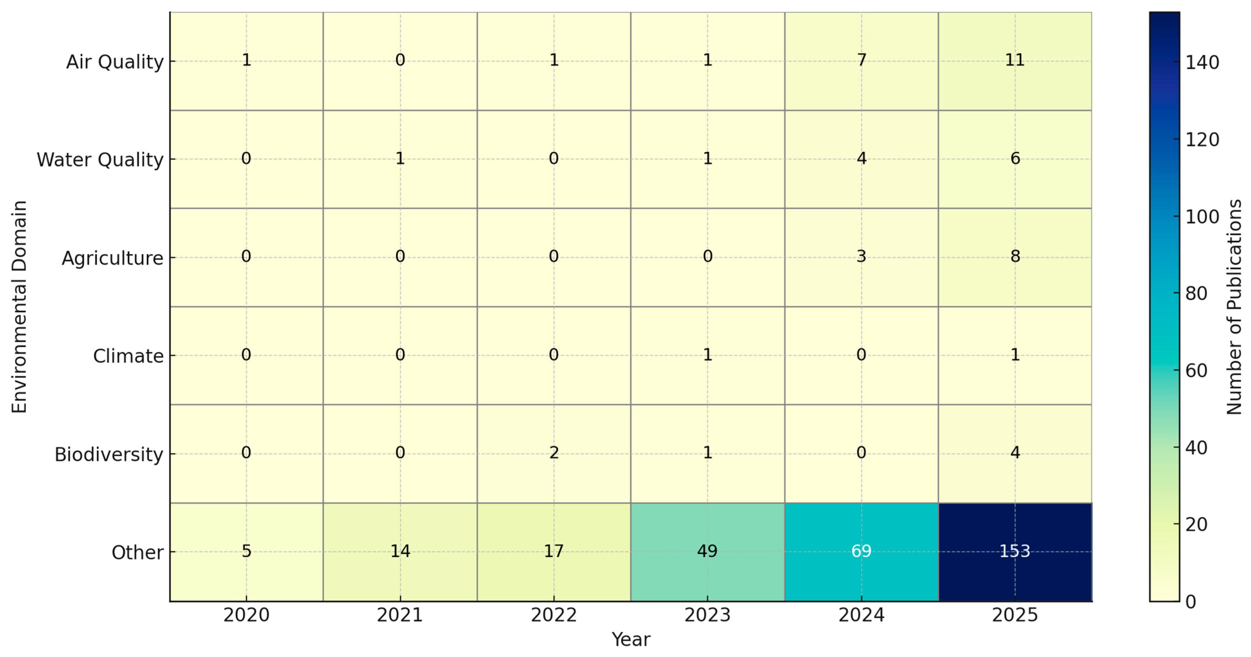 - Growing importance of explainability and governance.Several projects now include explainable components (e.g., feature-importance reporting or rule-based decision layers), anticipating the integration of ethical oversight frameworks in environmental AI.