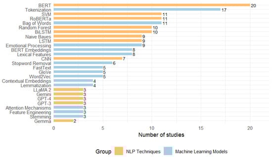 Table 5 lists the most common techniques. The most used method is tokenization (17 studies), a part of textual preprocessing, followed by the bag-of-words (11 studies) approach, a classic textual representation technique. Within semantic and emotional analysis, emotional processing is particularly notable (9 studies). Approaches linked to feature extraction and modern contextual representation, such as lexical features and BERT embeddings (each with eight studies), are also common. Other relevant techniques include stopword removal (in 6 studies) and vector representations, such as Word2Vec, GloVe, and FastText (each with five studies). In addition, linguistic normalization methods are identified, such as lemmatization and contextual embeddings (4 studies). Additionally, we find other less frequently used techniques such as stemming, feature engineering, and attention mechanisms (3 studies).