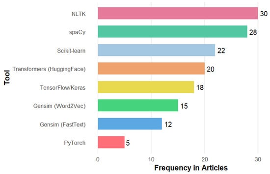Figure 3 shows the frequency of use of each tool, with the upper end dominated by the Natural Language Toolkit (30 studies) and spaCy (28 studies), which serve as pillars of preprocessing, ensuring the cleaning and normalization of the text before any other phase. Subsequently, the bars for Scikit-learn (22 studies) and Transformers (20 studies) indicate a shift toward feature extraction and a comparison between classical methods and advanced embeddings. In the middle positions, Word2Vec (15 studies) and FastText (12 studies) confirm their complementary role as static representations. At the same time, the shorter TensorFlow/Keras (18 studies) and PyTorch (5 studies) studies show that deep architectures are only applied when more complex modeling is required.
