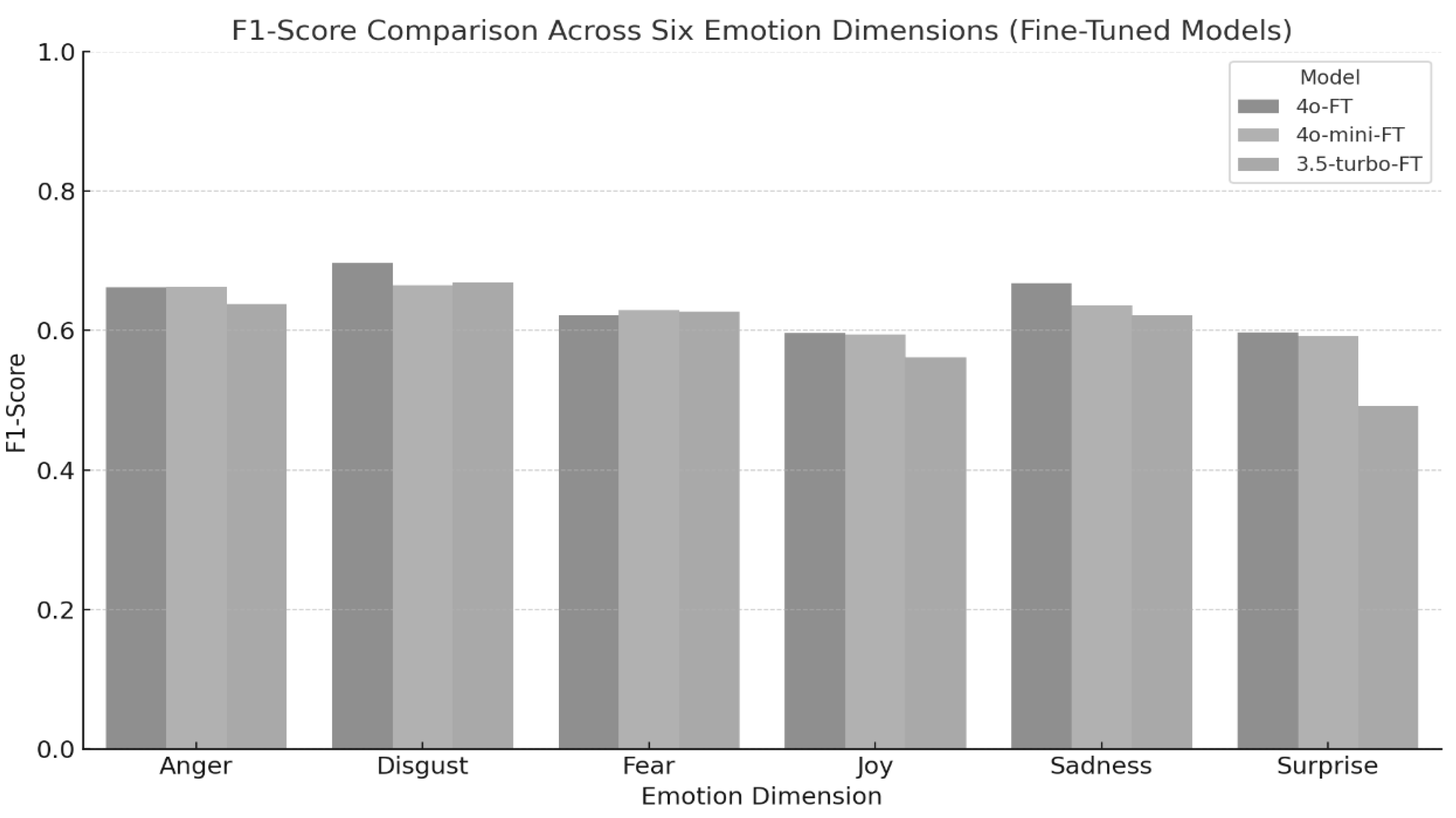 - Balanced data sampling improves performance consistency across emotional categories. The mixed sampling strategy effectively mitigated overrepresentation of negative emotions and enabled fairer learning across emotional dimensions, in line with previous work emphasizing the importance of addressing data imbalance in classification tasks [54]. Although variation in performance across emotion categories was observed, no extreme disparities were found. For example, the 4o-FT model reached a maximum accuracy of 0.912 and a minimum of 0.752 across emotional dimensions, with a median recall of 0.5 and only 0.101 variation between the highest and lowest F1-scores. These results suggest that balancing data distribution improves the overall stability of model recognition performance.