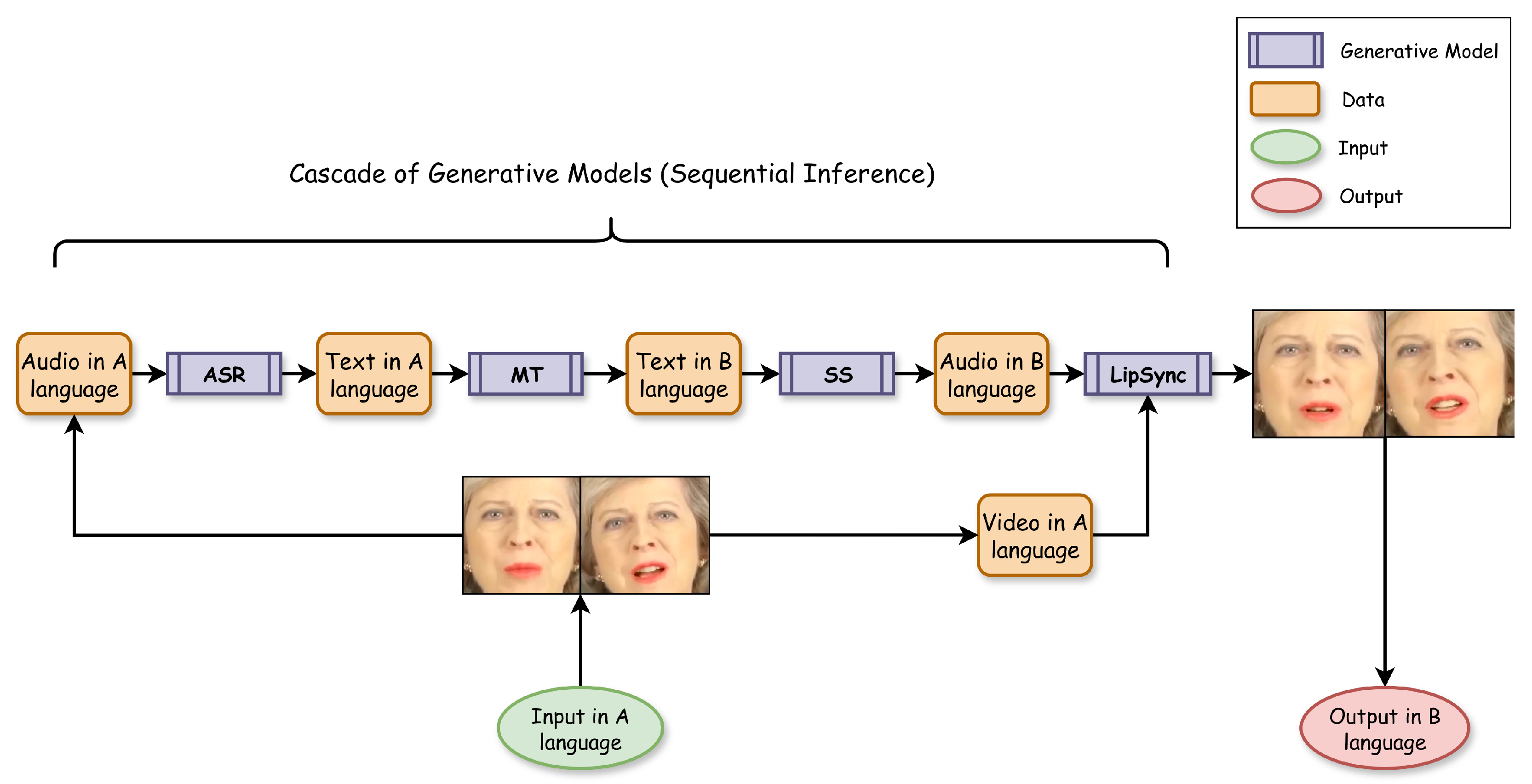 18]. Video translation aims to deliver a seamless multilingual experience by holistically translating all facets of human expression. This process involves converting spoken words, preserving the speaker’s vocal tone and style, and critically, synchronizing their lip movements with the translated speech. Such a comprehensive translation fosters more natural and fluid conversations, providing immense value to international business, global academic conferences, and multicultural social engagements. Achieving this requires end-to-end pipelines that integrate multiple GenAI models for tasks such as automatic speech recognition (ASR), machine translation (MT), text-to-speech (TTS) synthesis, and lip synchronization (LipSync), as illustrated in
