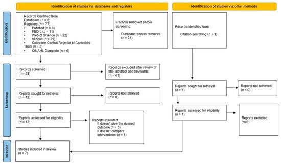 The search strategy identified 77 studies across six electronic databases: PubMed, Web of Science, PEDro, Scopus, CINAHL Complete, and the Cochrane Central Register of Controlled Trials. After removing duplicates, 53 studies were screened by title and abstract, resulting in 41 exclusions for not meeting the predefined eligibility criteria. Among the 13 full-text articles assessed, six were excluded because they either did not report the outcomes of interest or did not include a comparison between interventions, with one of the 13 studies having been identified through citation searching.