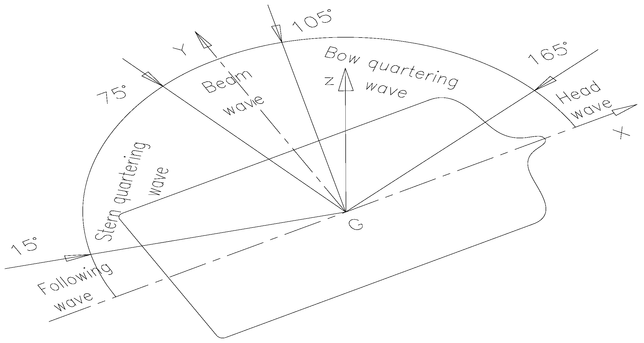 - Bow Quartering Wave: Angle between wave direction and ship heading is between ±105° and ±165°.