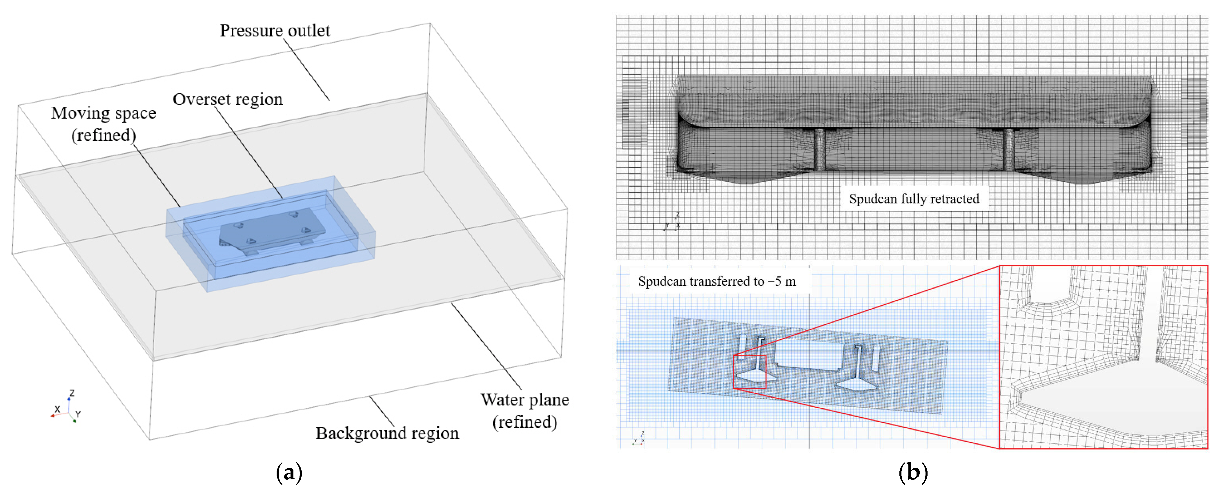 - In addition to fluid viscosity effects, the nonlinear characteristics of roll motion are determined by the WTIV’s cross-sectional shape, spudcan volume, and well structure. Through model tests and collaborative CFD verification, this study reveals the dual-mode effect of the additional moment of inertia () from the fluid in the spudcan well area on damping characteristics. When the leg is fully retracted, damping is enhanced by approximately 58%, and the roll period is shortened by about 7%.
