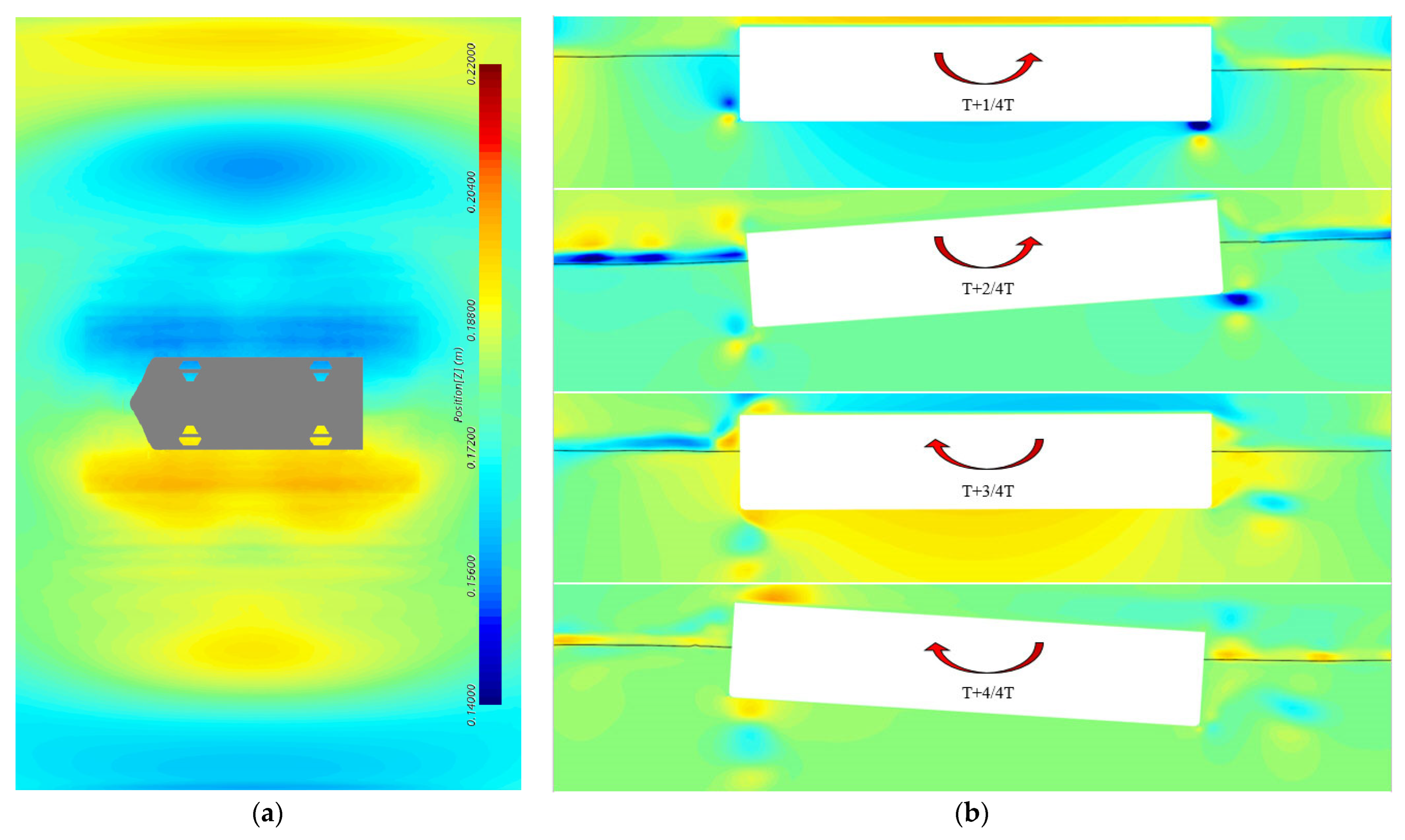 - The wave has been fully dissipated before reaching the boundary, with no signs of reflected waves. The peak spacing (about 3.0 m) is significantly smaller than the theoretical wavelength (about 12.6 m) calculated based on the roll period, indicating that the radiation wave generated by the hydrostatic roll free decay test is a short-term transient wave, rather than a continuous gravity wave. The change in free surface wave height is shown in Figure 5a.