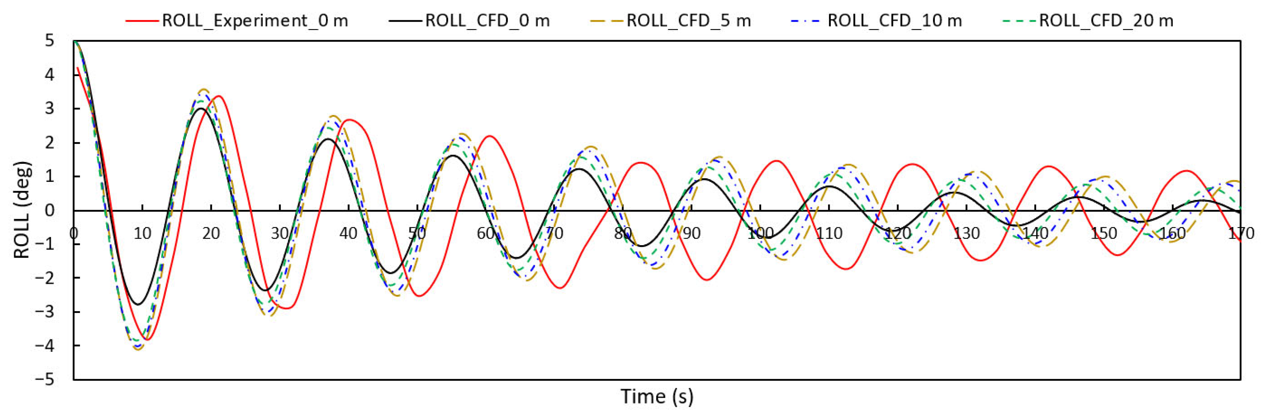 - The CFD results in the first two cycles are basically consistent with the experimental data. Starting from the third cycle, a phase difference between the CFD and test results gradually emerges. As time progresses, the phase error accumulates, and the amplitude decay rate in the CFD simulation is faster than that of test. The free decay curves of roll in still water are shown in Figure 6. The average decay rates from the CFD predictions and model test results are 0.8972 and 0.9176, respectively, with a difference of 0.0205 (corresponding to approximately 2.23%). The RMSE of the peak points is 1.1194 deg, mainly due to the difference in the initial roll angle.