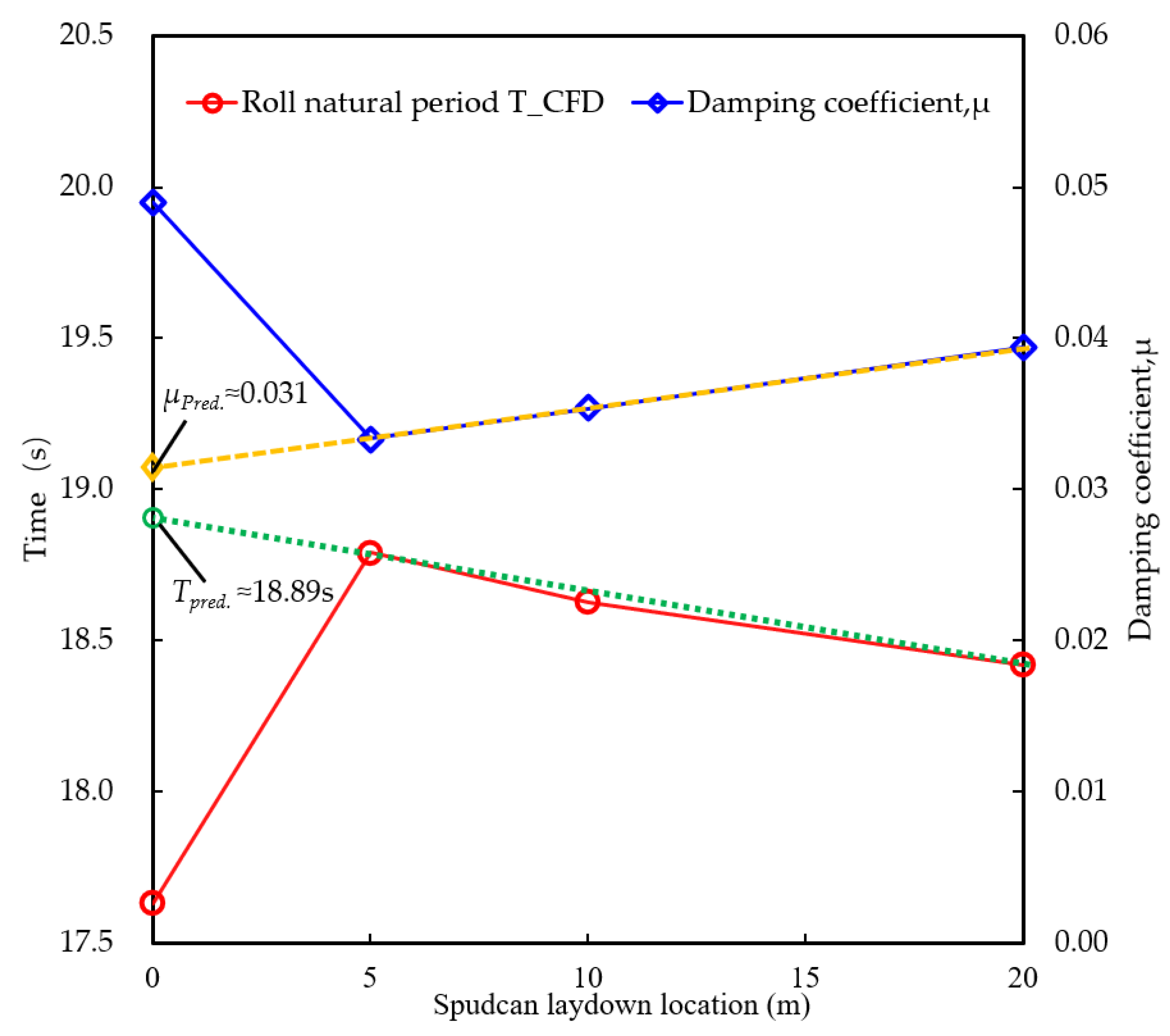 | Case | Spudcan Location (m) | VCG (m) | Damping Coefficient, μ | Roll Natural Period T_CFD |