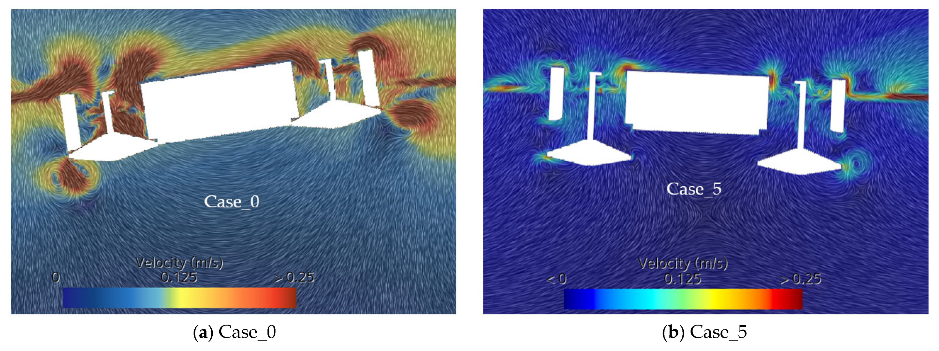 - In Case_0 (spudcans fully retracted), fluid exchange between the well and the exterior is restricted. This results in a higher liquid level inside the starboard well than the external free surface, with the opposite occurring on the port side. The fluid inside the well generates a counterclockwise restoring moment, which significantly counteracts the port-side rolling tendency. Consequently, the well structure in Case_0 functions similarly to a free-flooding anti-roll tank, shortening the roll period by approximately 7% and increasing the roll damping by about 58%—even exceeding the damping achieved in Case_5, which has a lower center of gravity.