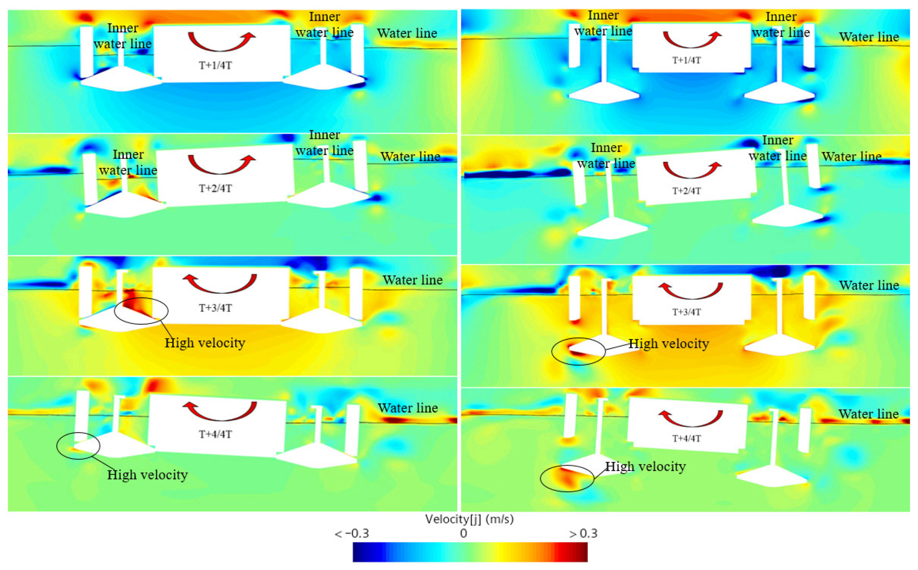 - In Case_5 (spudcans lowered 5 m), the opening to the sea is sufficiently large, allowing rapid fluid exchange between the well and the exterior. The free liquid surfaces inside the port and starboard wells remain largely level with the external sea surface. As a result, the anti-rolling effect of the well structure diminishes, and the roll damping becomes significantly lower than in Case_0.