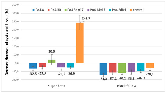 Based on the obtained results, the percentage of decrease/increase in the number of H. schachtii eggs and larvae was calculated according to Formula (1):