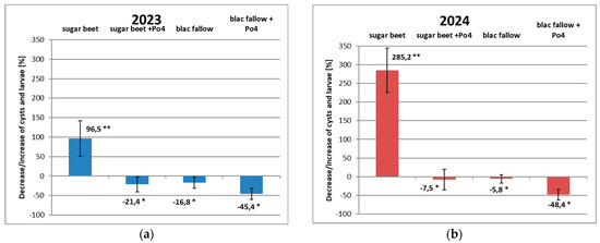 The influence of P. ostreatus Po4 strain on the percentage decrease/increase in the H. schachtii population in the field experiments; (a) in 2023; (b) in 2024. Bars represent the mean percentage change in nematode population ± standard deviation (SD) (3 independent replicates for each strain and condition). Statistical analysis was performed using ANOVA with Duncan’s test (p = 0.05). Negative values represent population reduction; positive values represent population increase relative to initial population. Data indexed by ** or * do not differ significantly.