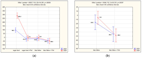 Statistical analysis was performed using Microsoft Excel. Mean values and standard deviations (SDs) were calculated at a 95% confidence level, and results were expressed as mean ± SD and presented in graphs. Statistical analyses were performed using analysis of variance (ANOVA) in Statistica 13.3 software. Data were compared (p = 0.05) using Duncan’s test. Analyses were performed in two ways: (1) for both years, 2023–24, analyses of all variants of the field test were performed; (2) separately, also for both years, analyses were made for a part including only fallow soils treated and untreated with Po4 strain. This type of analysis was also prepared for laboratory experiments.