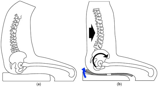 Comparison between conventional and flexible seat pan designs: (a) conventional flat seat pan limiting pelvic rotation and flattening lumbar curvature; (b) flexible seat pan promoting forward pelvic tilt and natural S-shaped spinal alignment. The black arrows indicate the facilitation of lumbar curvature, while the blue arrow shows the rotation of the flexible seat pan that induces anterior pelvic tilt.