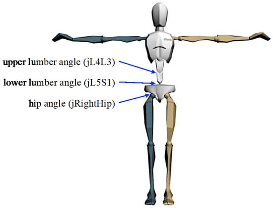 This study compared two chairs with different types of seat pans using motion and EMG analysis equipment. Xsens (Enschede, The Netherlands) motion capture equipment was used to analyze the joint angles of the pelvic area in a seated posture. Xsens uses 17 sensors attached to the human body to define 23 body segments, and utilizes this to measure 22 human joint angles [55]. The joint angle is measured as the three-dimensional angle between two connected segments. Among the 17 sensors, those relevant to this study (used to the angles of the pelvic area and their attachment sites) are located on the pelvis (around the L5 location at the height of the anterior superior iliac spine), sternum (middle of the sternal bone of the chest), and right/left upper legs (middle of the lateral thigh). Among the 22 joint angles provided by Xsens’s human model, this study used the upper lumbar angle (Xsens code: jL4L3), lower lumbar angle (Xsens code: jL5S1), and hip angle (Xsens code: jRightHip), as illustrated in Figure 2. Before measuring each participant’s movements, the sensors were calibrated using the Xsens MVN software. To measure muscle strength in a seated posture, the TeleMyo Clinical DTS, surface EMG (sEMG) measurement equipment from Noraxon (Scottsdale, AZ, USA), was utilized. By referring to the EMG guidelines, sensors were attached to the human body surface on the left and right erector spinae and rectus abdominis muscles. After attaching the sensors, calibration was performed using the Noraxon myoRESEARCH software, and then maximum voluntary contraction (MVC) was measured, using the guidelines to assess the two muscles.