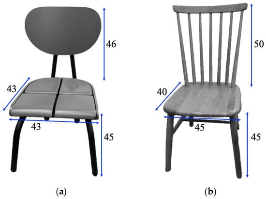 This study selected two chairs with different seat pan designs (Chair A: the proposed chair with a four-segment flexible seat pan; Chair B: a conventional table chair with a flat seat pan) to analyze the characteristics of sitting posture according to the design features of the seat. Chair A has a seat divided into four sections, allowing for flexible movement, which makes it easier for people with different body shapes and anthropometric characteristics to adopt a correct sitting posture. This design was biomechanically intended to support the natural movement of the pelvis and accommodate soft tissue dynamics around the ischial tuberosities. By allowing independent motion of each segment, the seat pan was expected to facilitate forward pelvic tilt and reduce localized pressure accumulation, which in turn promotes upright sitting posture and spinal alignment. The other chair (Chair B) has a flat seat pan. Although the backrest designs differ, this study focused on the seat pan and did not examine the effects of the backrest design. The backrests of the chairs used in this study provide basic support and have standard physical characteristics, and the design dimensions of the two chairs are similar. While these chairs are not typical office task chairs, they are versatile and can be widely used in home or personal workspace settings. We assume that the differing backrest designs will not significantly impact the seat pan experiment because the primary focus is on how the seat pan influences posture and muscle usage, particularly in conditions where the backrest is minimally or not relied upon. The backrests were designed to serve as basic support features rather than active components, thus minimizing their influence on the measured outcomes. To further isolate the seat pan’s effects, the chairs used in the experiment were selected without cushions, armrests, or height adjustment features, and both were made of wood to ensure consistency in material properties [4,14,26,56,57]. Information regarding the shapes and sizes of the chairs is presented in Figure 3.