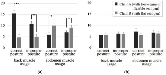 Significant differences in muscle usage were observed between the two chairs only when leaning against the backrest. When leaning against the backrest, Chair A demonstrated significantly higher values in back muscle usage (5.9~10.8% by analysis conditions) and lower values in abdominal muscle usage (−4.2 ~ −2.1% by analysis conditions) for both correct and improper postures compared to Chair B (Table 2, Figure 6a). This suggests that Chair A more effectively maintains the spine’s S-shape using the back muscles. When not leaning against the backrest, no significant differences were observed (Figure 6b).