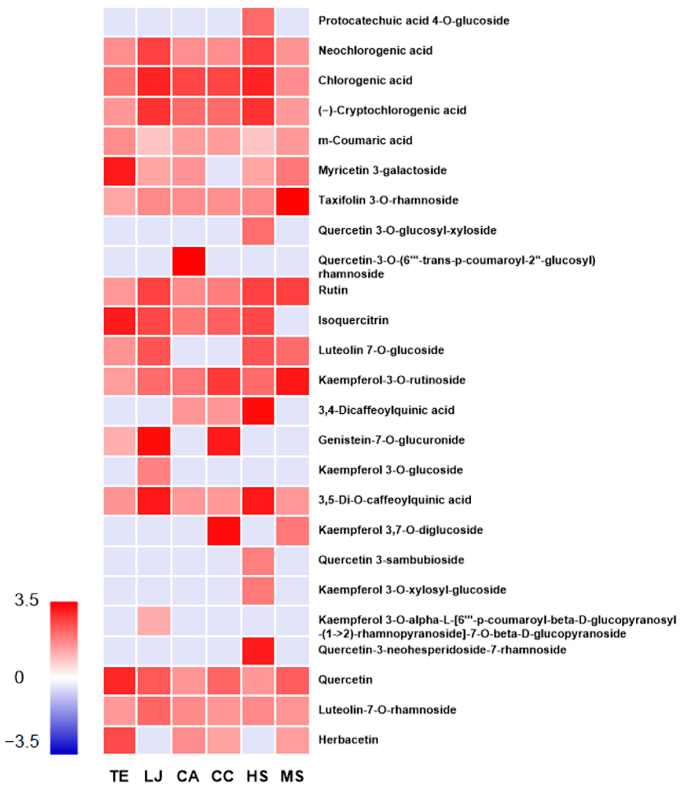 | Neochlorogenic acid | 4.43 | [M-H]¯ | 353.09 | 191, 135, 179 | C16H18O9 | Phenolic acid | TE, LJ, CA, CC, HS, and MS |