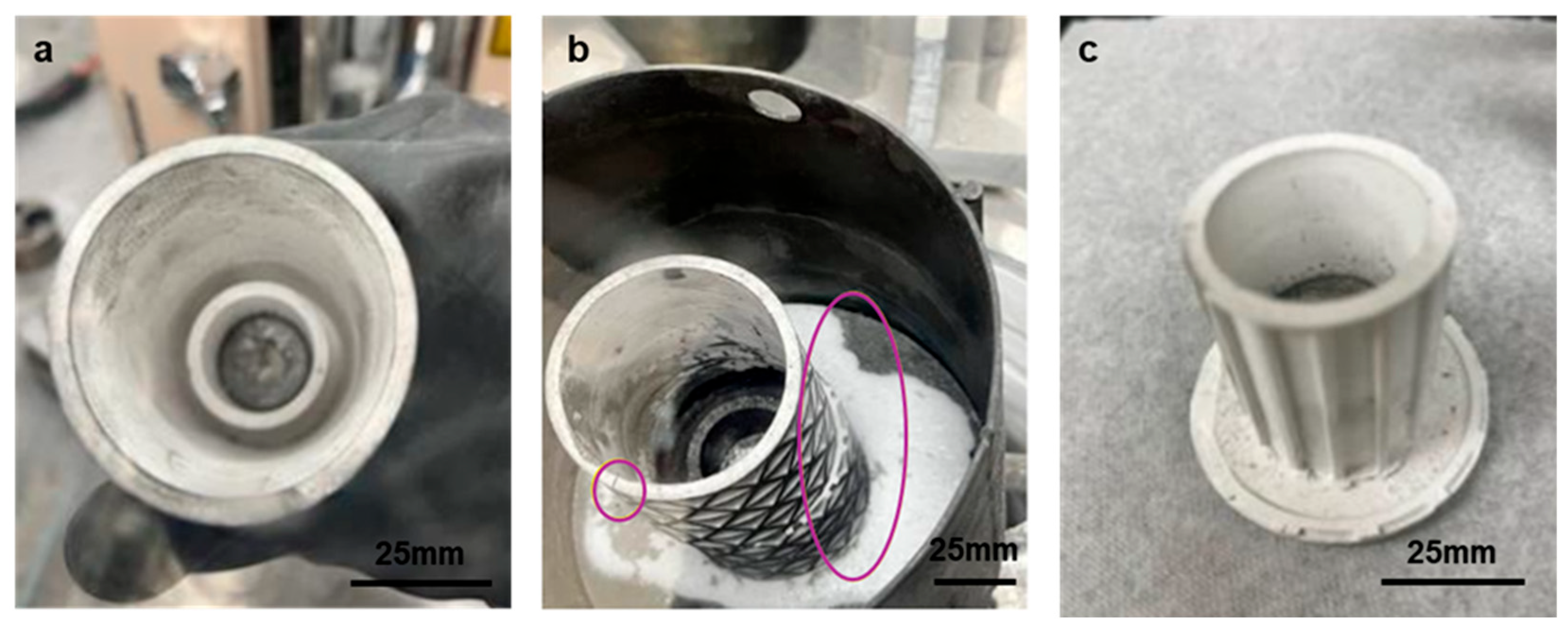 - Schwarzer-Fischer, E.; Abel, J.; Sieder-Katzmann, J.; Propst, M.; Bach, C.; Scheithauer, U.; Michaelis, A. Study on CerAMfacturing of Novel Alumina Aerospike Nozzles by Lithography-Based Ceramic Vat Photopolymerization (CerAM VPP). Materials 2022, 15, 3279. [Google Scholar] [CrossRef]
