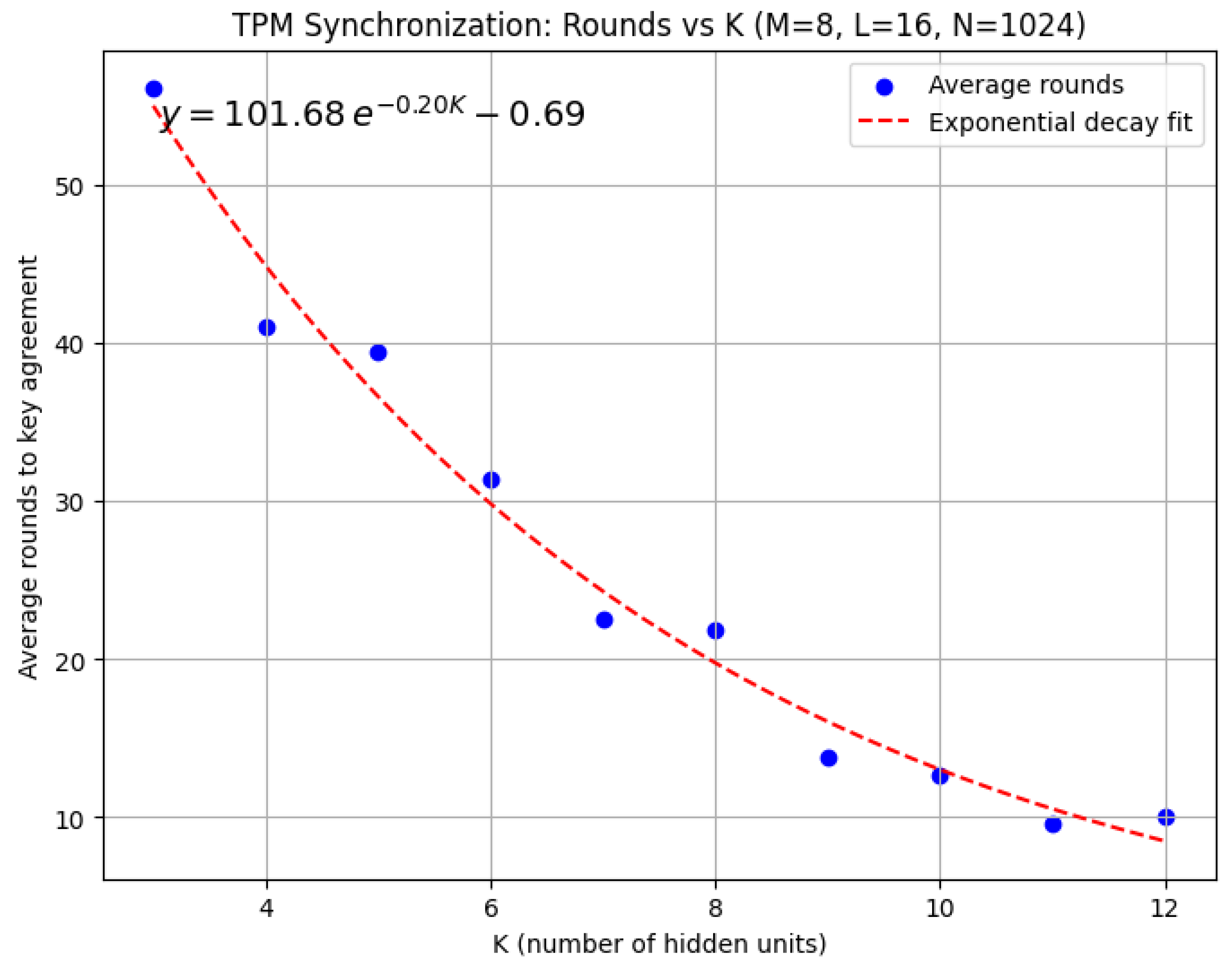 - Computation and Output Exchange: Each party computes the activations of the hidden neurons and the TPM output, then exchanges the output value with the other party: