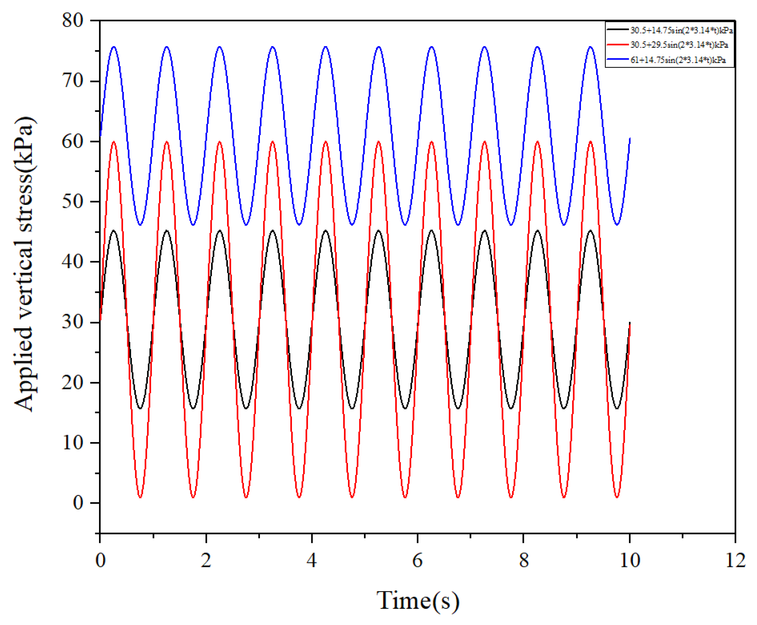 3; and common embankment heights. Accordingly, the nominal vertical stresses of 14.75, 30.5, and 61 kPa adopted in this study were selected to span a representative range of in situ subgrade stresses under seasonal frost conditions. The lowest level (14.75 kPa) corresponds to shallow overburden and relatively light traffic loading, the intermediate level (30.5 kPa) represents a typical combined stress due to embankment self-weight and high-speed train loading, and the highest level (61 kPa) reflects an upper-bound confinement associated with thicker embankments or higher axle loads. In the dynamic tests, sinusoidal loads were applied around these mean values (e.g., 30.5 + 29.5 sin(2πft) kPa and 61 + 14.75 sin(2πft) kPa), such that the peak stresses fell within the range reported for high-speed railway subgrade surfaces. Thus, in this study, three dynamic loading conditions were used, as shown in