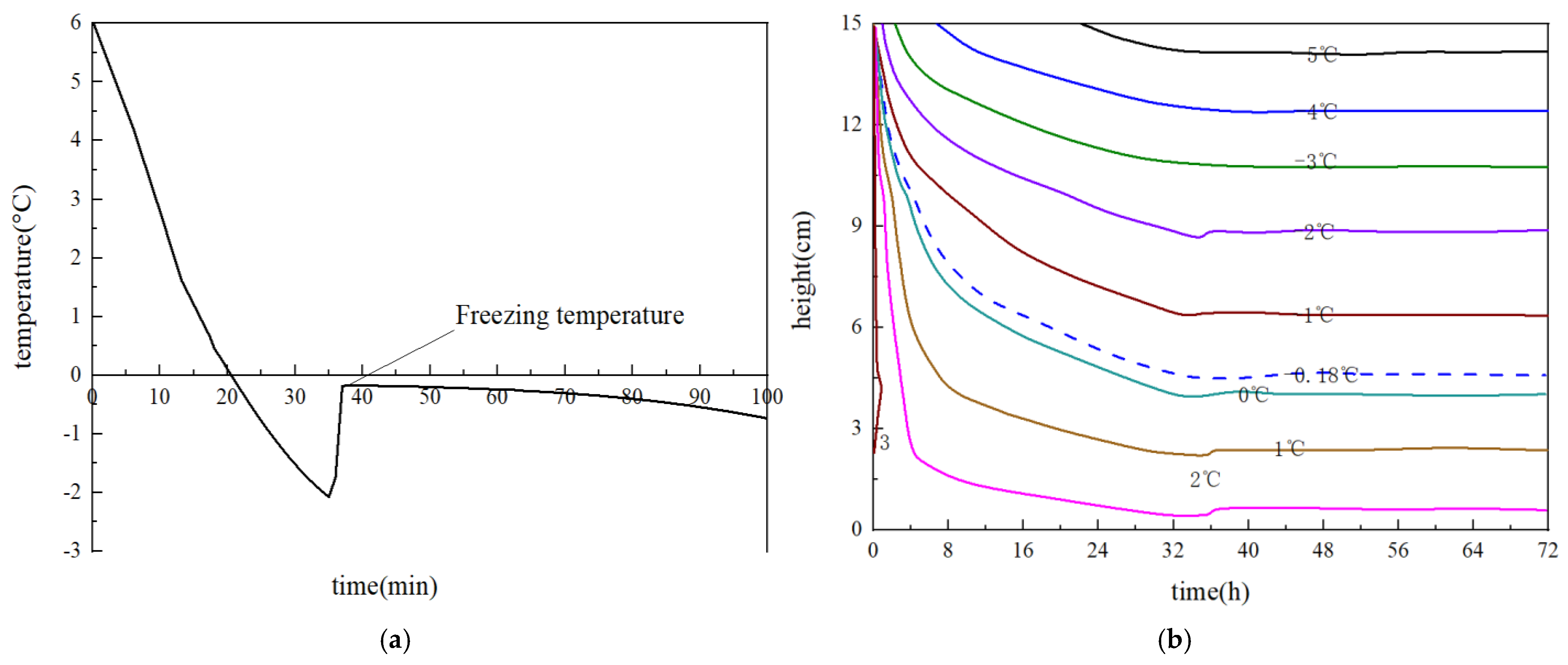 Figure 5a, the temperature at which the internal temperature of the specimen stabilized was defined as the freezing point, which was approximately −0.18 °C.