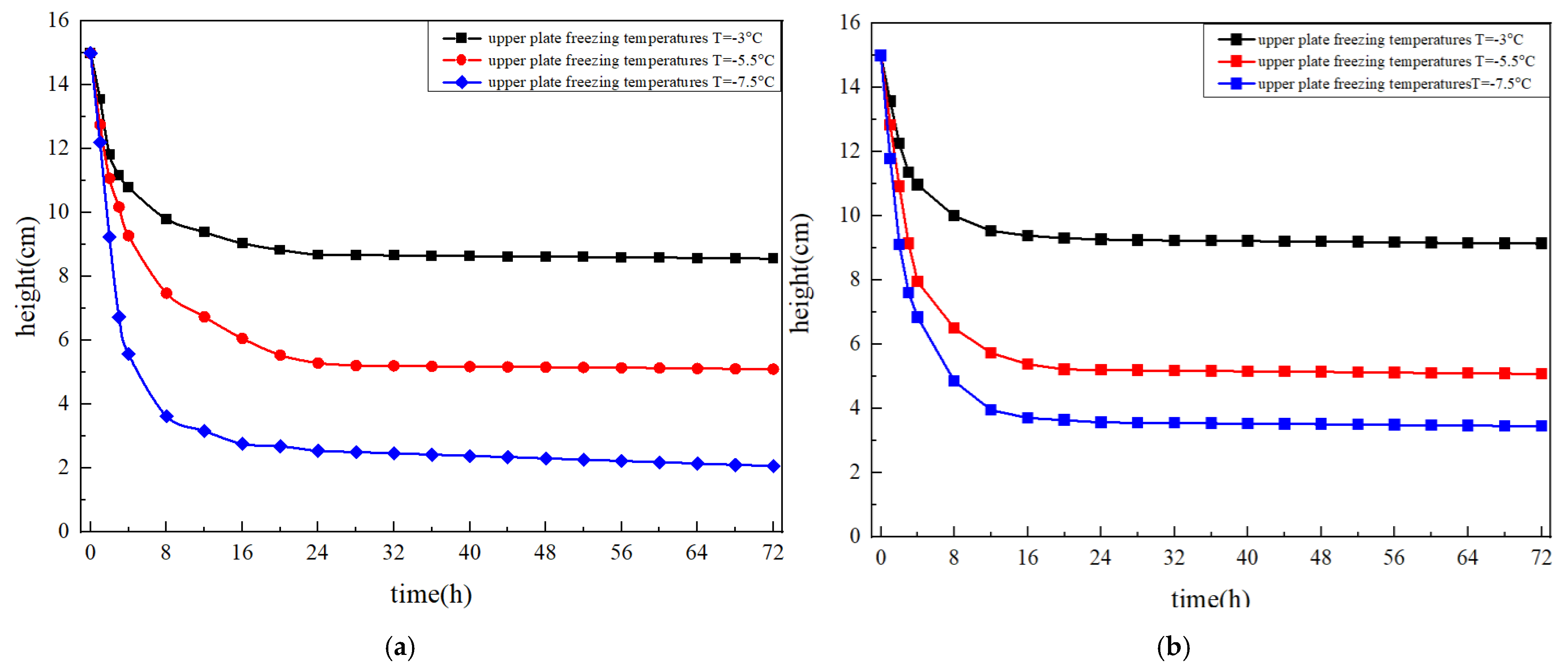 Figure 7a,b, the frozen depth increased with decreasing upper plate freezing temperature. When the upper plate freezing temperatures were −3 °C, −5.5 °C, and −7.5 °C, the frozen depths were approximately 6.3 cm, 9.68 cm, and 13.46 cm, respectively, for the closed system under static loading; and 5.85 cm, 9.5 cm, and 11.5 cm, respectively, for the open system under dynamic loading. These results indicate that the frozen depth in the open system was slightly smaller than that in the closed system. This difference occurs because, in the open system, the continuous water supply reduces the thermal gradient by altering the soil water content and thermal conductivity. Consequently, more cooling capacity is consumed by the additional water migration and phase transition, resulting in a smaller frozen depth.