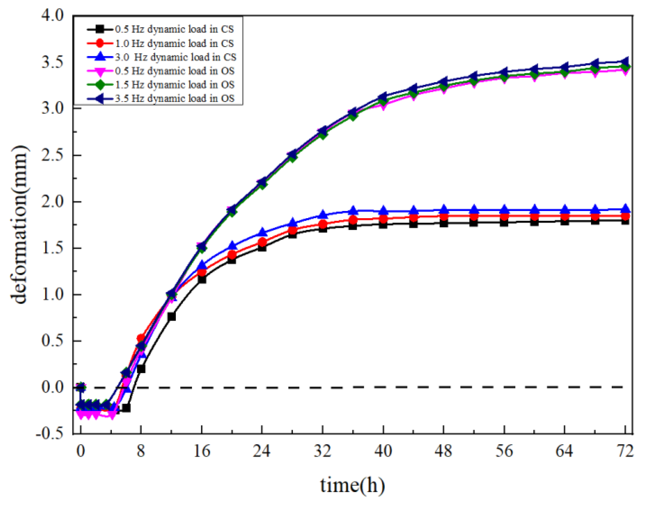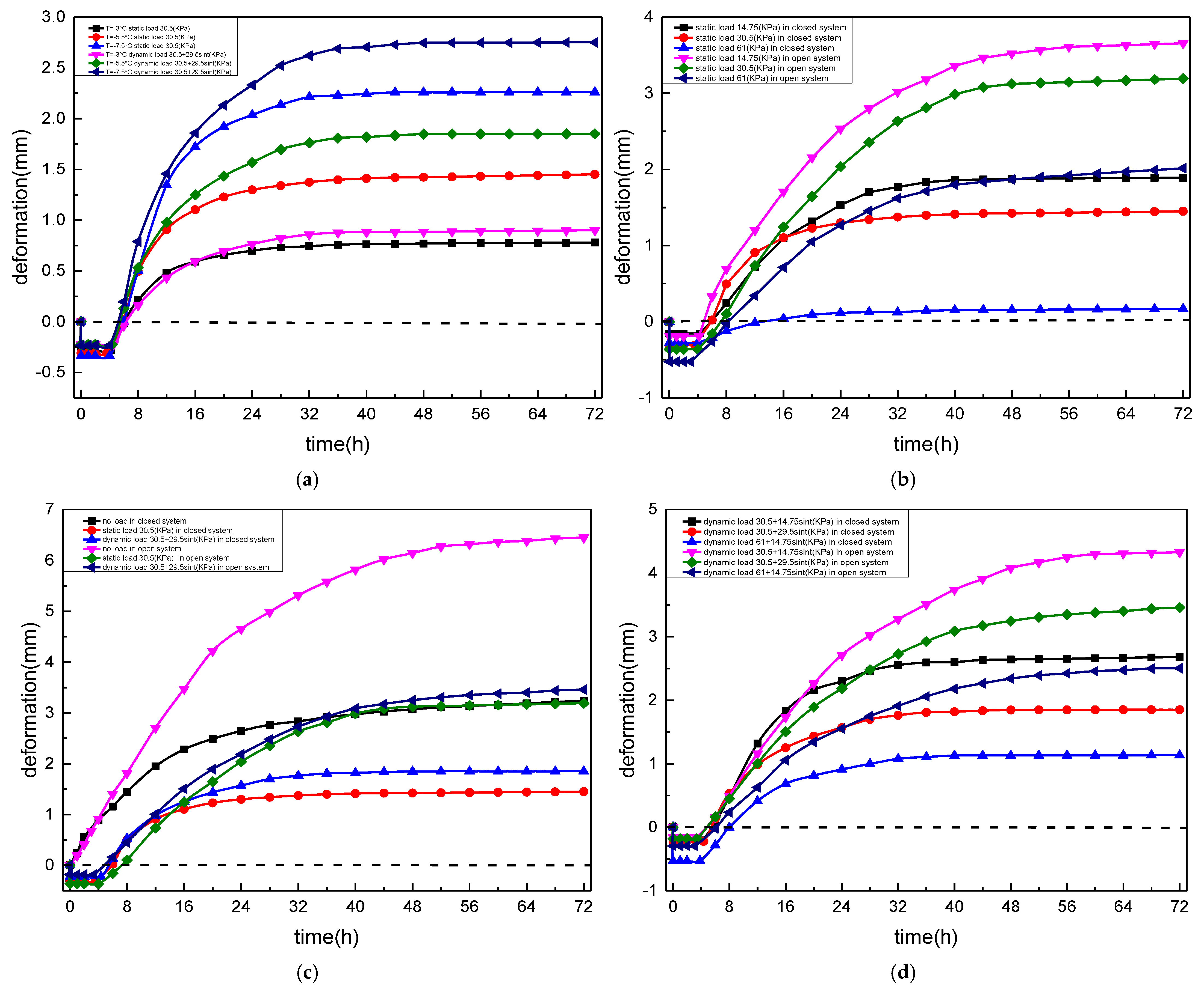 Figure 9c,d. Increasing the static load from 14.75 kPa to 61 kPa led to greater initial compression (0.16–0.53 mm) and significantly reduced the total frost-heave deformation. A similar pattern was observed for dynamic loading: higher amplitude loads (e.g., 61 + 14.75 sin t kPa) produced smaller frost-heave deformation compared with lower amplitude loads.