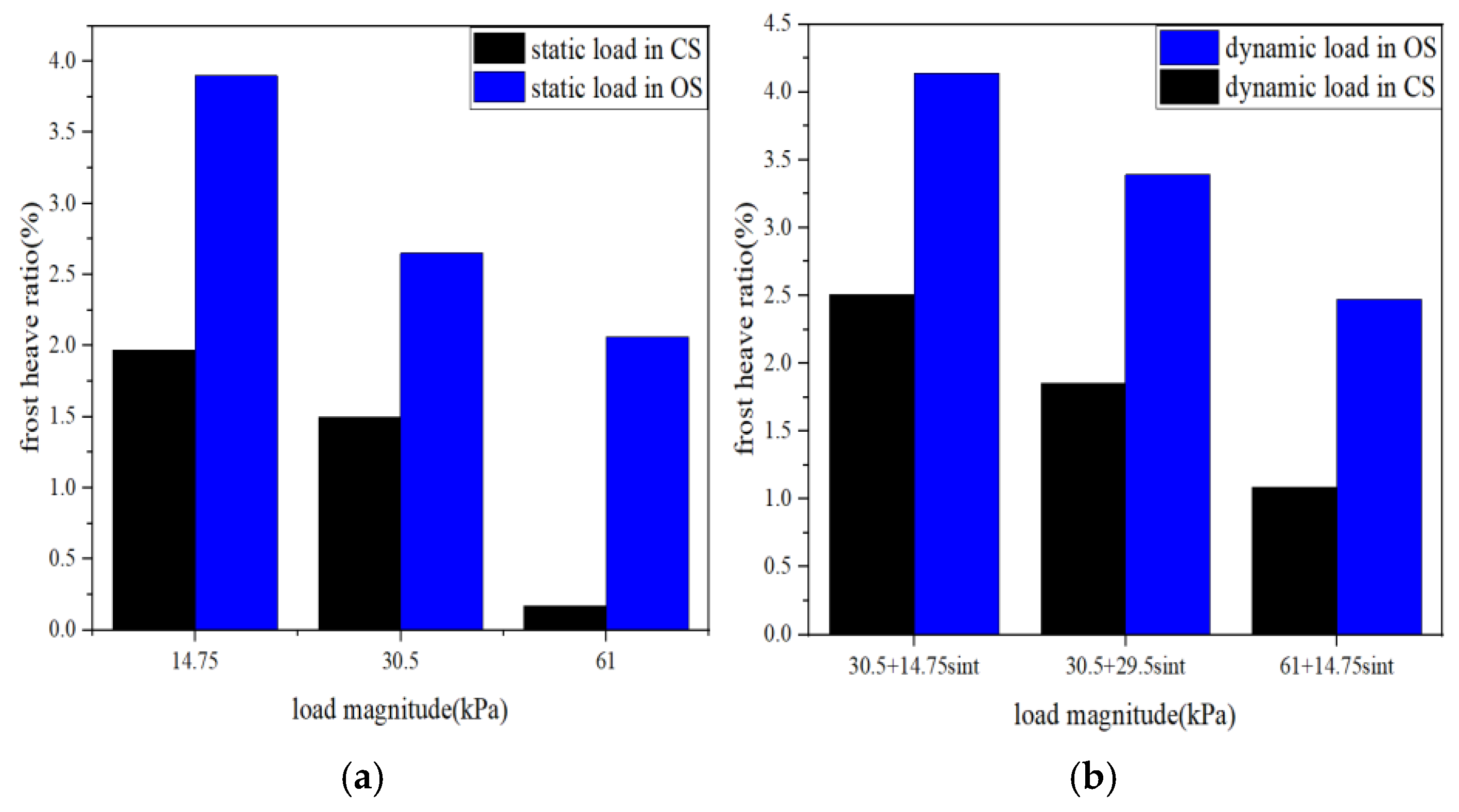 Figure 9b, deformation behavior varied with load form. Under identical thermal conditions (−5.5 °C), the magnitude of frost heave followed the order: no load > dynamic load > static load, in both closed and open systems. This demonstrates the inhibitory effect of external loading on frost-heave deformation. Moreover, the open system produced greater frost heave than the closed system due to enhanced water migration from external sources. The influence of load magnitude is presented in