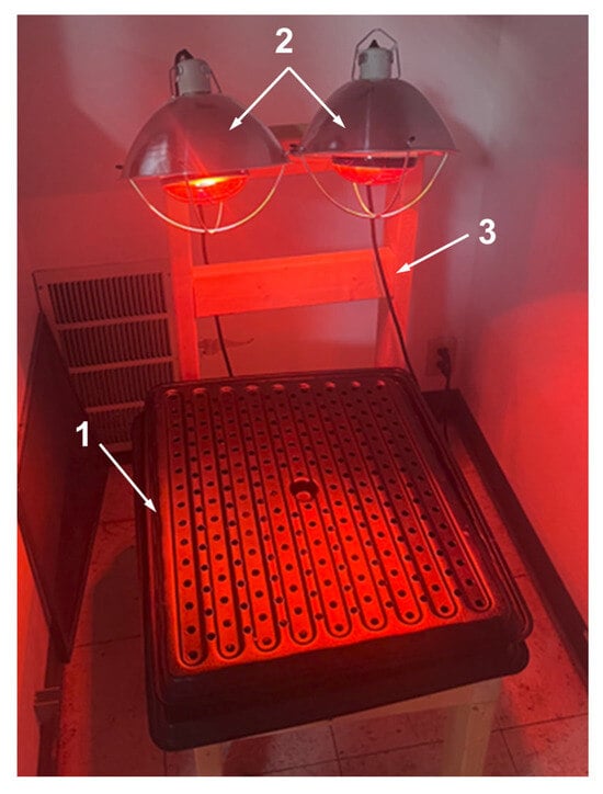 Passive solar-drying setup within a psychrometric chamber: (1) trays made of polyvinyl ether; (2) infrared heat lamps; and (3) a wooden stand holding the trays and lamps.