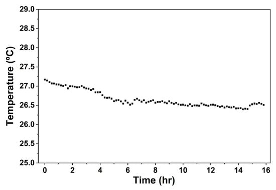 The summer months (June, July, and August) of Malatya, Turkey, have an average temperature between 26 and 27 °C [9]. During the process, the passive solar drier (trays) was placed in the psychrometric chamber; the infrared bulbs were used to simulate solar energy. The psychrometric chamber was able to maintain the temperature between 26.4 and 27.4 °C, as shown in Figure 3. Previous studies have shown the effectiveness of the psychrometric chamber to maintain the target temperature [28,29]. Maintaining this target temperature is essential, as it enables the set-up to be reproducible, scalable, and practical for drying operators in Malatya, Turkey.