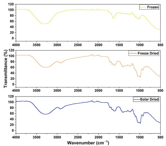 ATR-FTIR was used to acquire an infrared spectrum for each apricot sample. These spectra reveal chemical properties such as functional groups [48]. As shown in Figure 9, the IR spectrum of the frozen sample appears to have a broader peak around 3300 cm−1. This wavenumber is characteristic for O-H stretching, including phenolics, and, in the frozen sample, was mostly contributed by water [28,49]. There also was a peak around 1635 cm−1 for the frozen apricot sample, where O-H bonds are expected to bend [28]. Given the significantly higher water content of frozen apricot samples (Figure 4), these results were expected. The passive solar-dried and freeze-dried samples also had a peak at approximately 985 cm−1. This region represents the nutritional contents such as sugars and organic acids [49]. In the solar and freeze-dried samples, the lower water content concentrates the nutrients. Therefore, a peak is expected when compared to the frozen samples. The freeze-dried and passive solar-dried IR spectra were, overall, very similar, indicating a similar chemical composition.