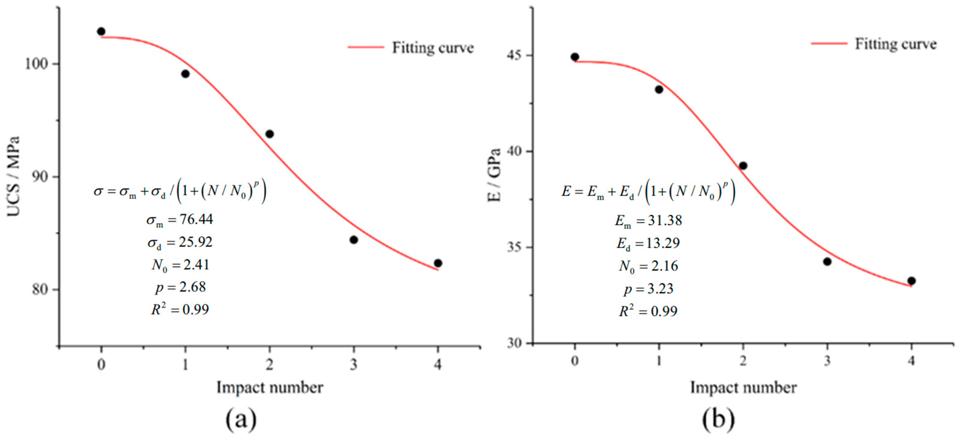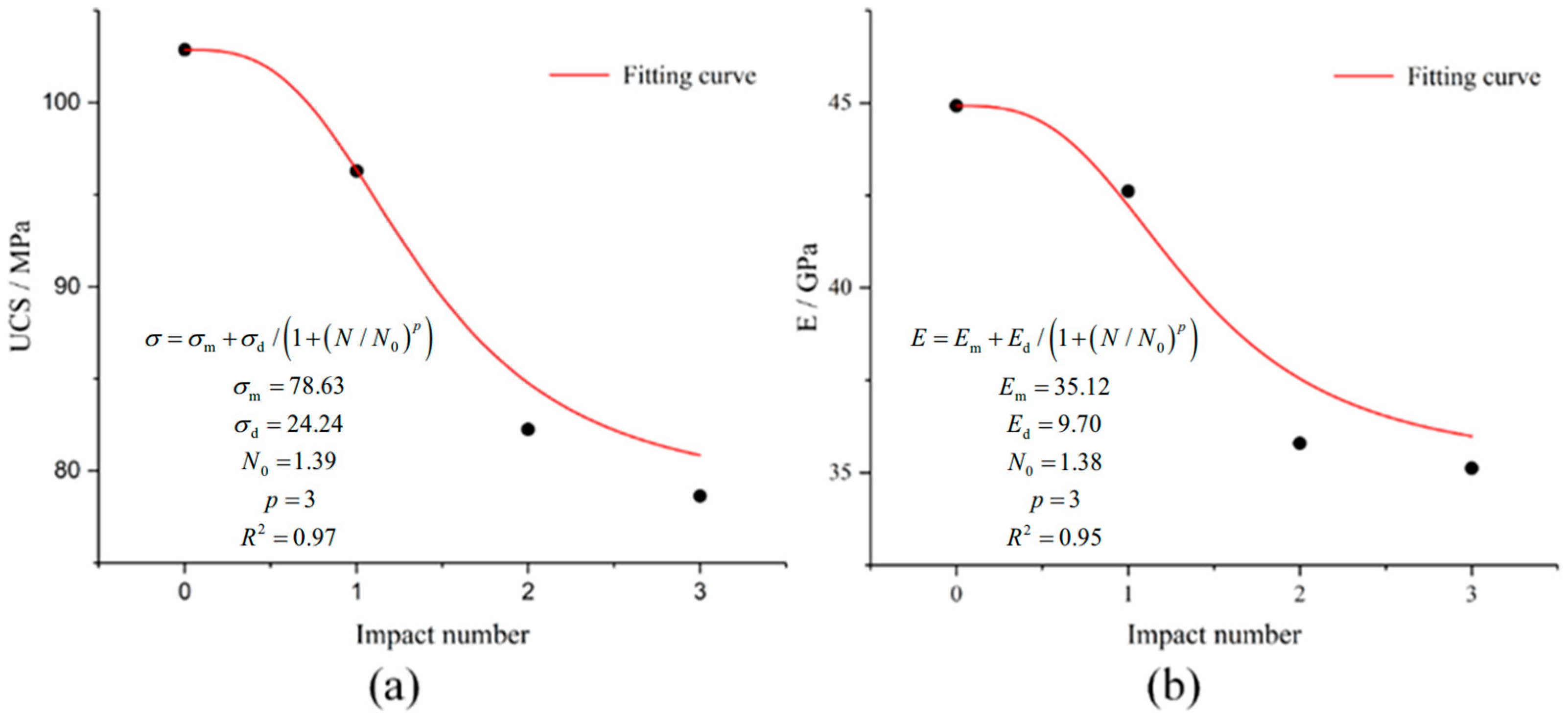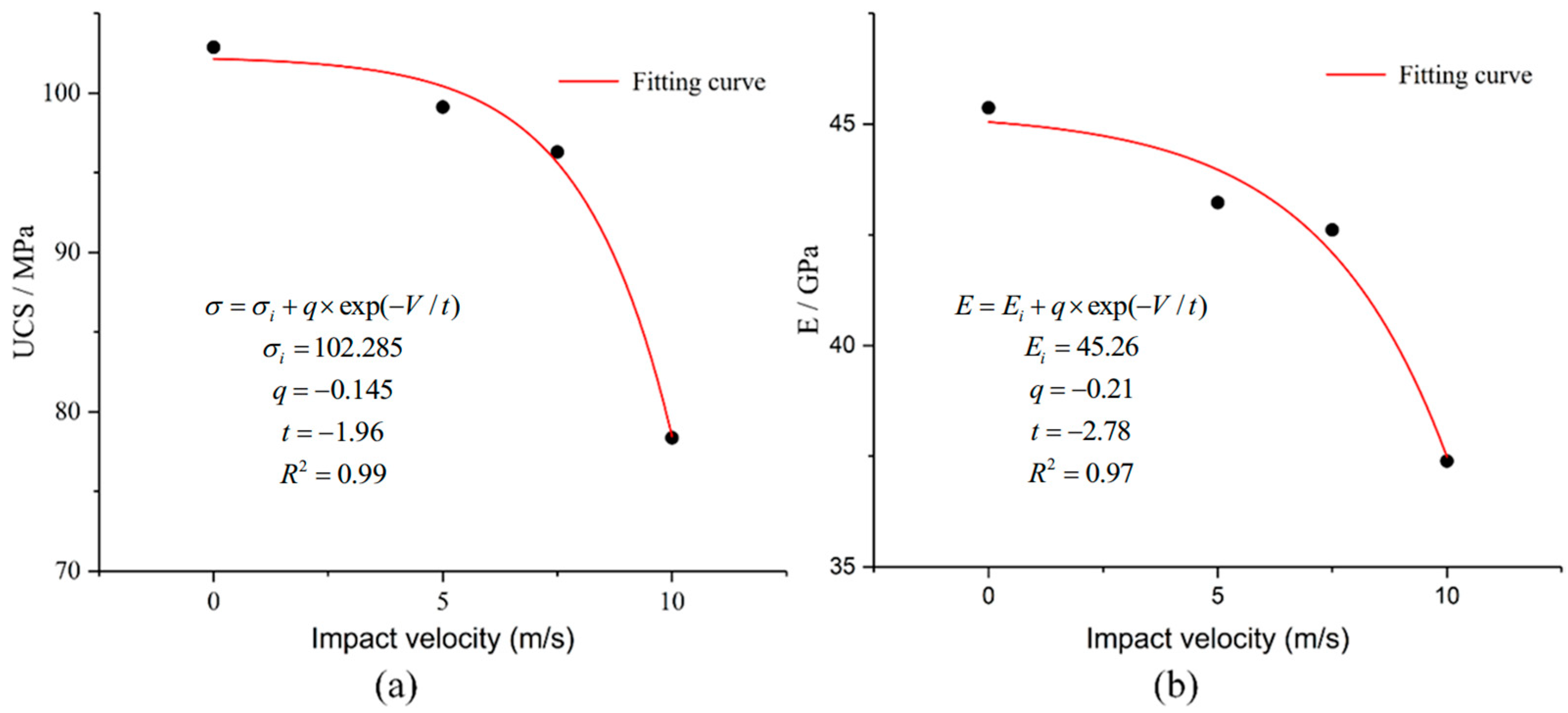 - At the internal damage level, regarding the behavior of a granite specimen after a single impact, the proposed negative exponential models can well capture the variation in UCS and Young’s modulus with the impact velocity. When the impact velocity increases from 5.0 to 10.0 m/s, both the UCS and Young’s modulus of the granite specimen gradually decrease, experiencing a more obvious reduction when the impact velocity exceeds 7.5 m/s.