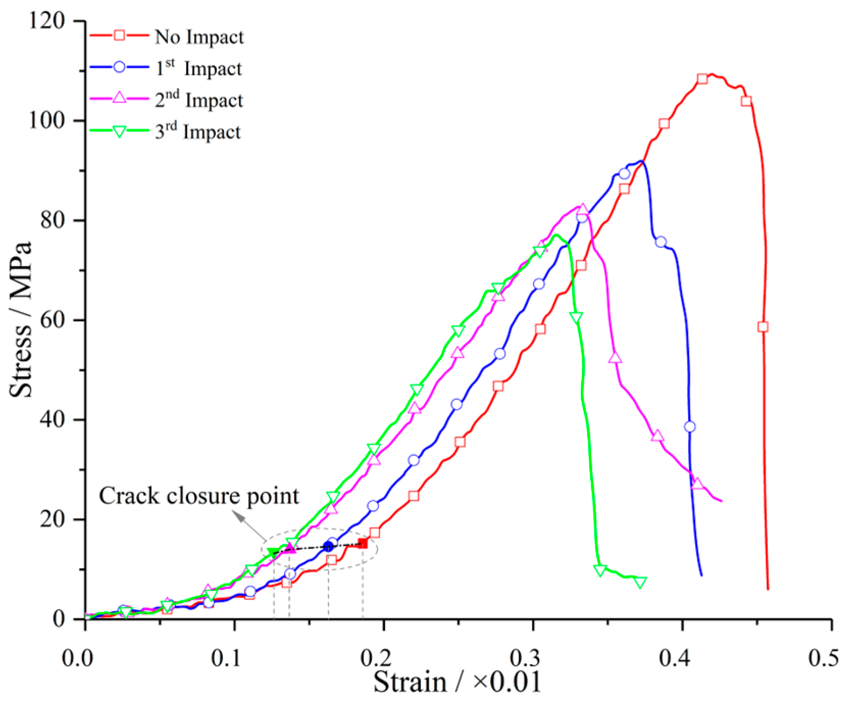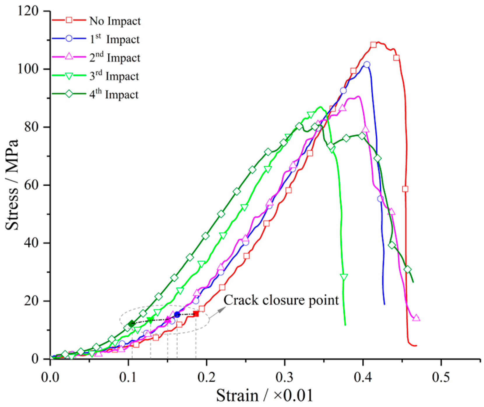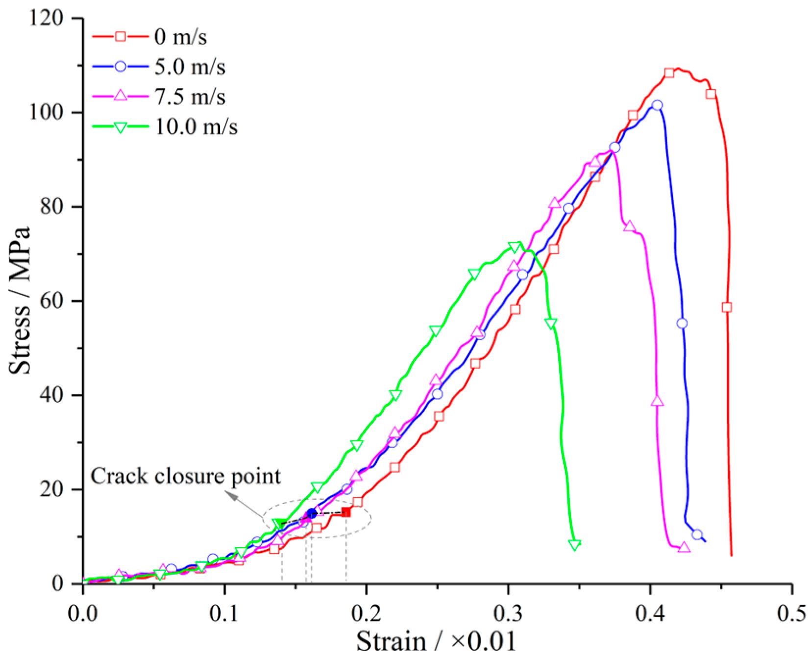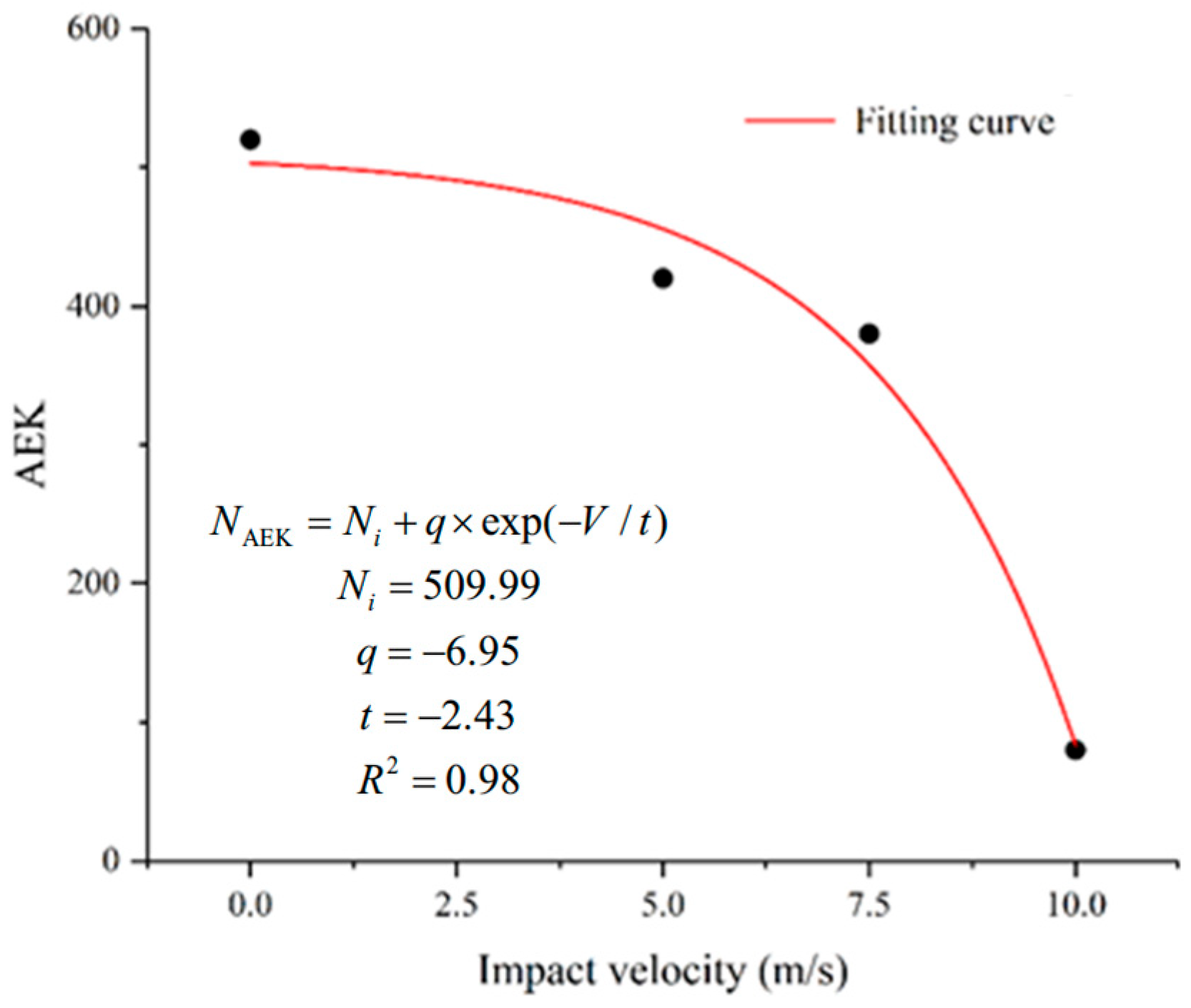 - At the internal damage level, regarding the behavior of a granite specimen after a single impact, the proposed negative exponential models can well capture the variation in UCS and Young’s modulus with the impact velocity. When the impact velocity increases from 5.0 to 10.0 m/s, both the UCS and Young’s modulus of the granite specimen gradually decrease, experiencing a more obvious reduction when the impact velocity exceeds 7.5 m/s.