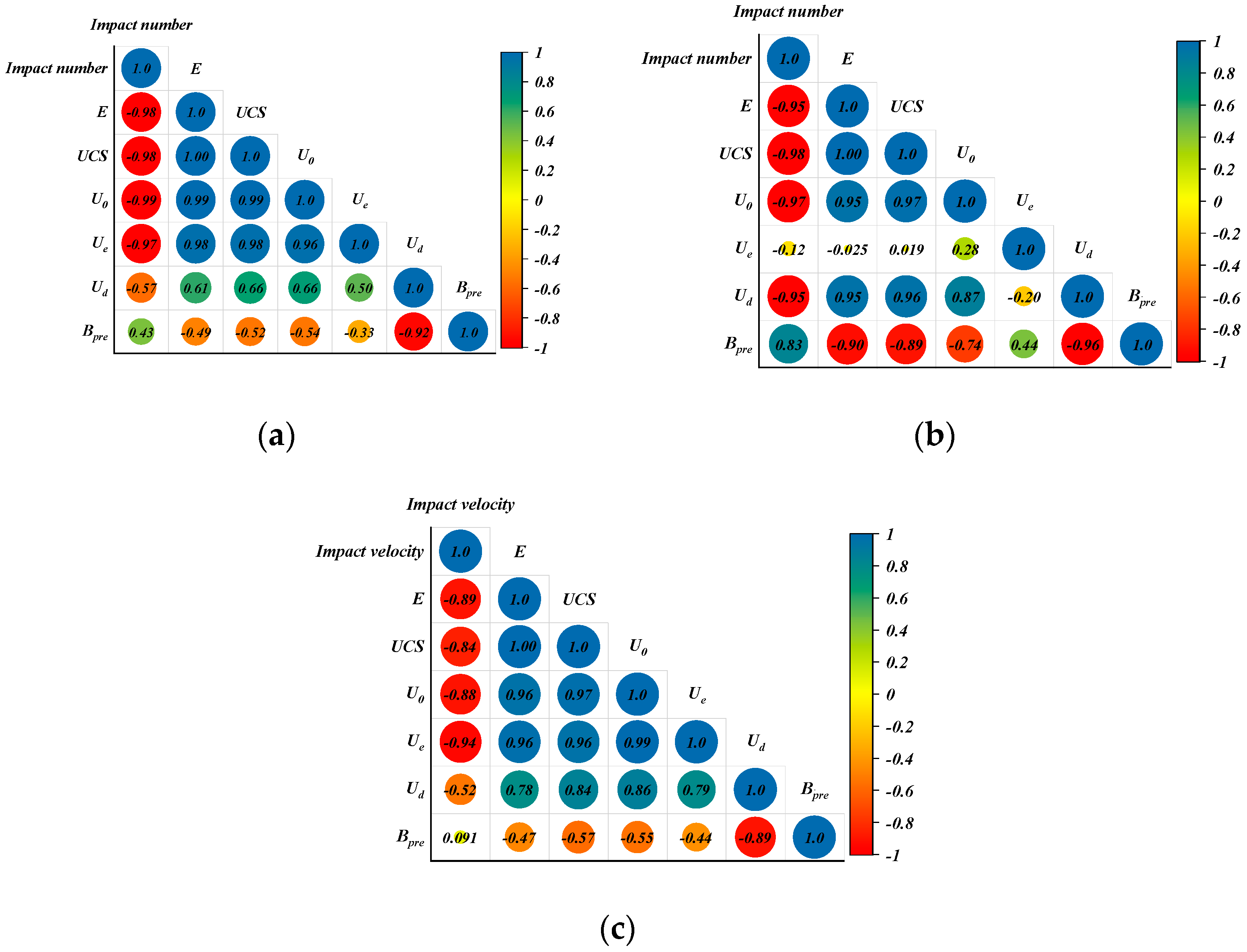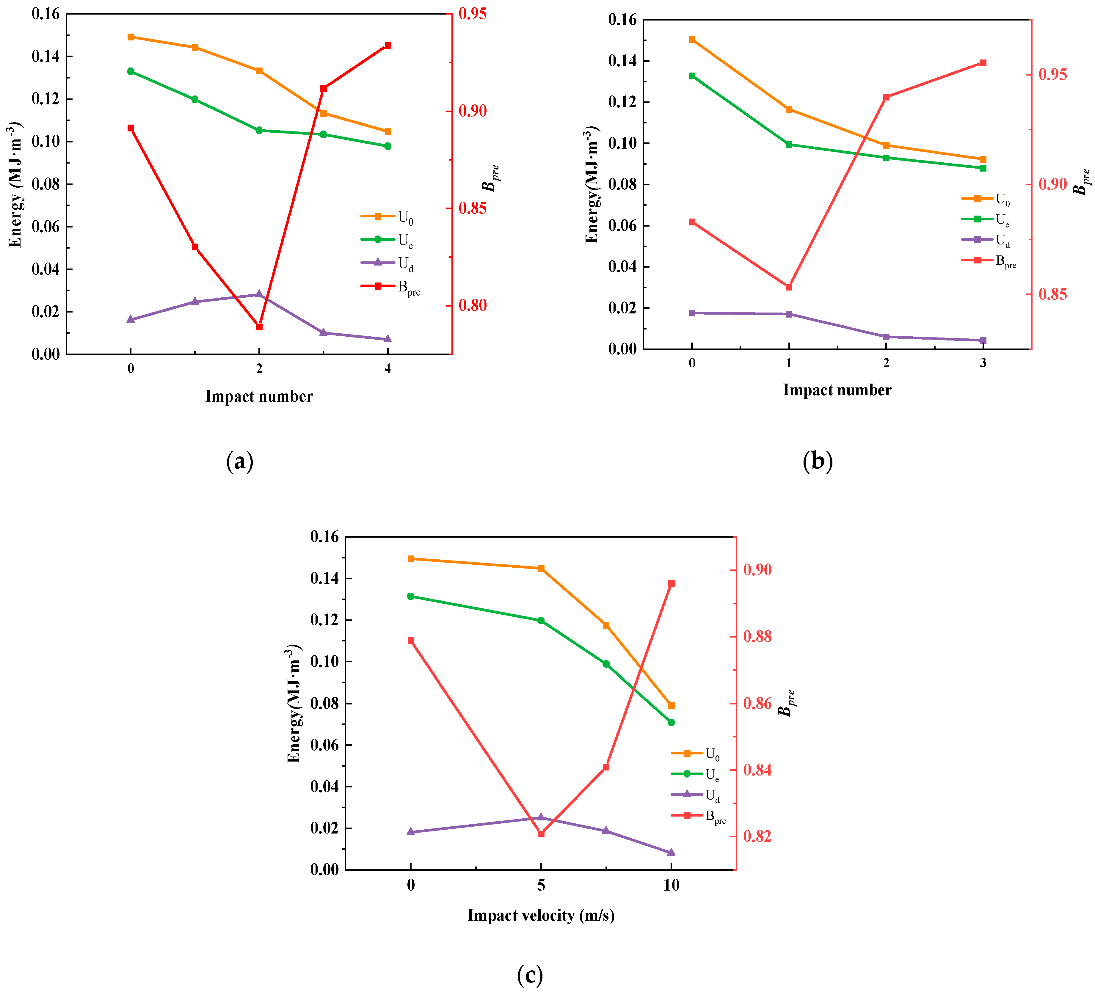 - Different repeated impact numbers and velocities have significant effects on the brittle failure of granite, and there is an obvious negative correlation with granite’s mechanical property parameters (E and UCS) and the total energy absorbed before the peak (U0). This indicates that the more often and the faster the granite is impacted, the more likely it is to fail in a brittle manner. Additionally, the higher the impact velocity and frequency, the greater the negative impact on the mechanical properties and the total energy it can absorb before peak stress is reached.