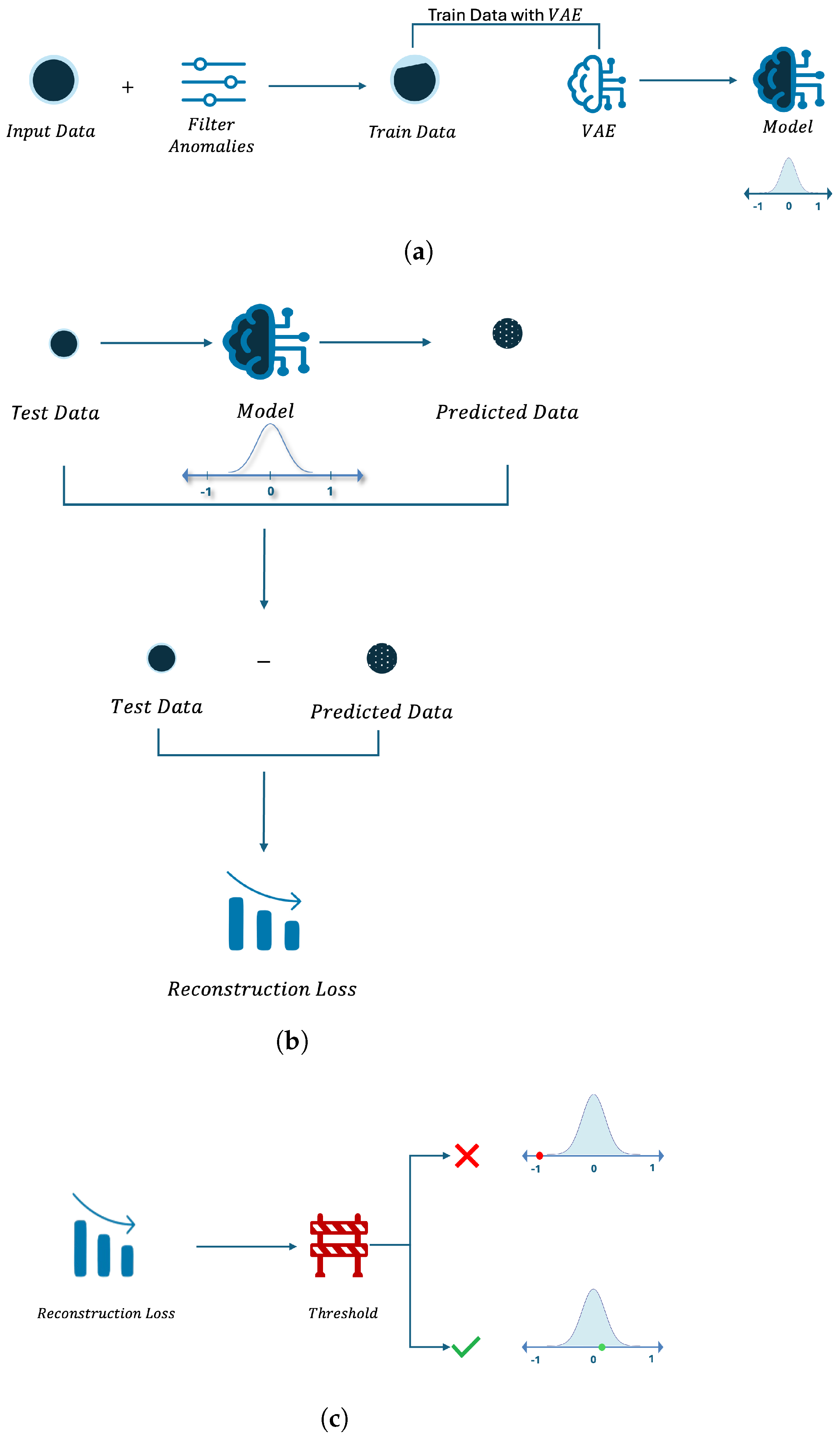 Figure 2b, the reconstruction loss is calculated using the Mean Squared Error (MSE) between the reconstructed data and the original data. If the resulting loss exceeds a predefined threshold, the data point is classified as an anomaly, as shown in