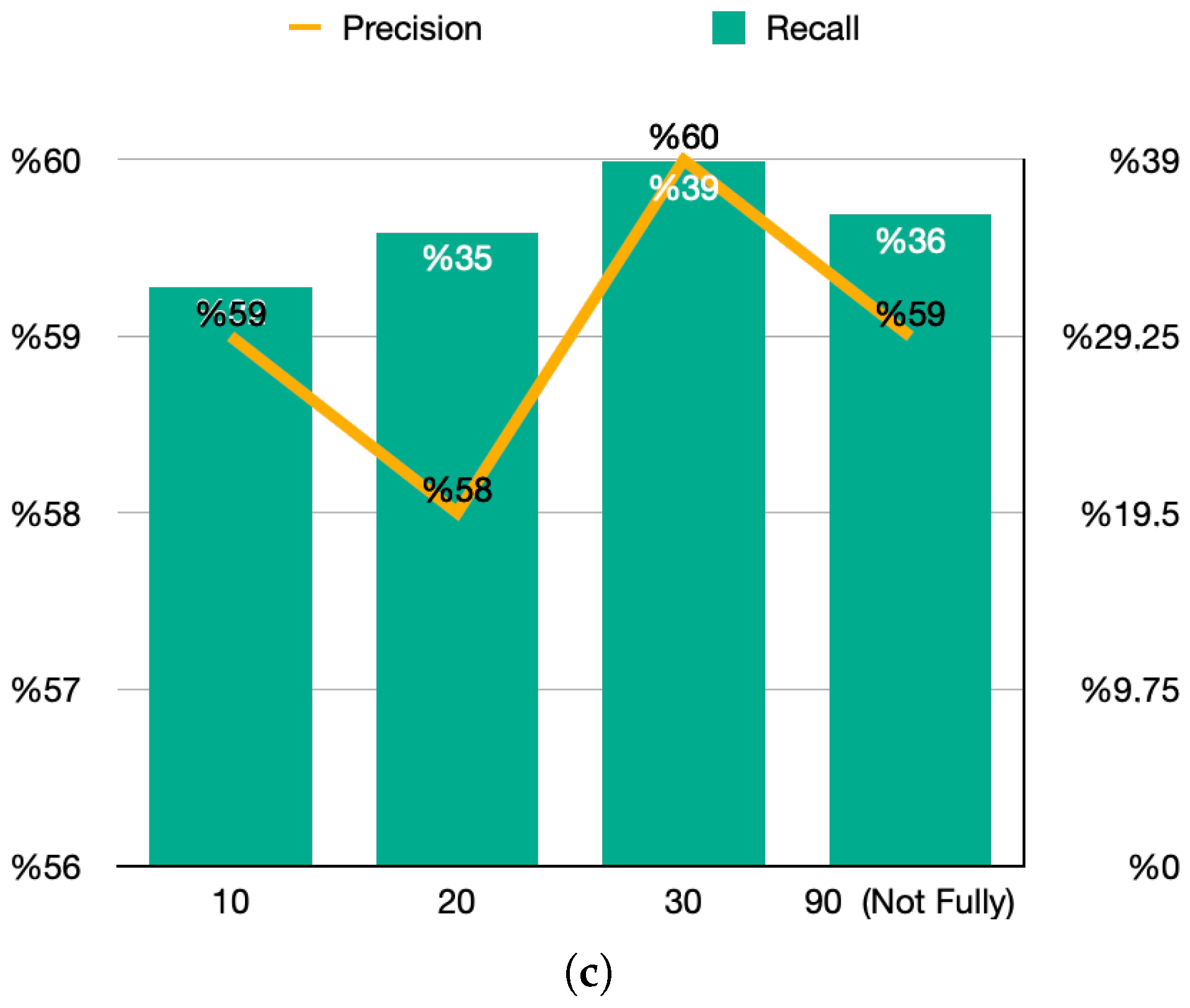 Figure 4c. indicate that the 30-day training set yielded the highest performance, with 60% precision and 39% recall. Although the 90-day set performed better than the 10-day set, it still fell short of the 30-day set. This reinforces that deliberately stitching together non-continuous data segments in the 90-day window weakened the algorithm’s ability to preserve temporal coherence.