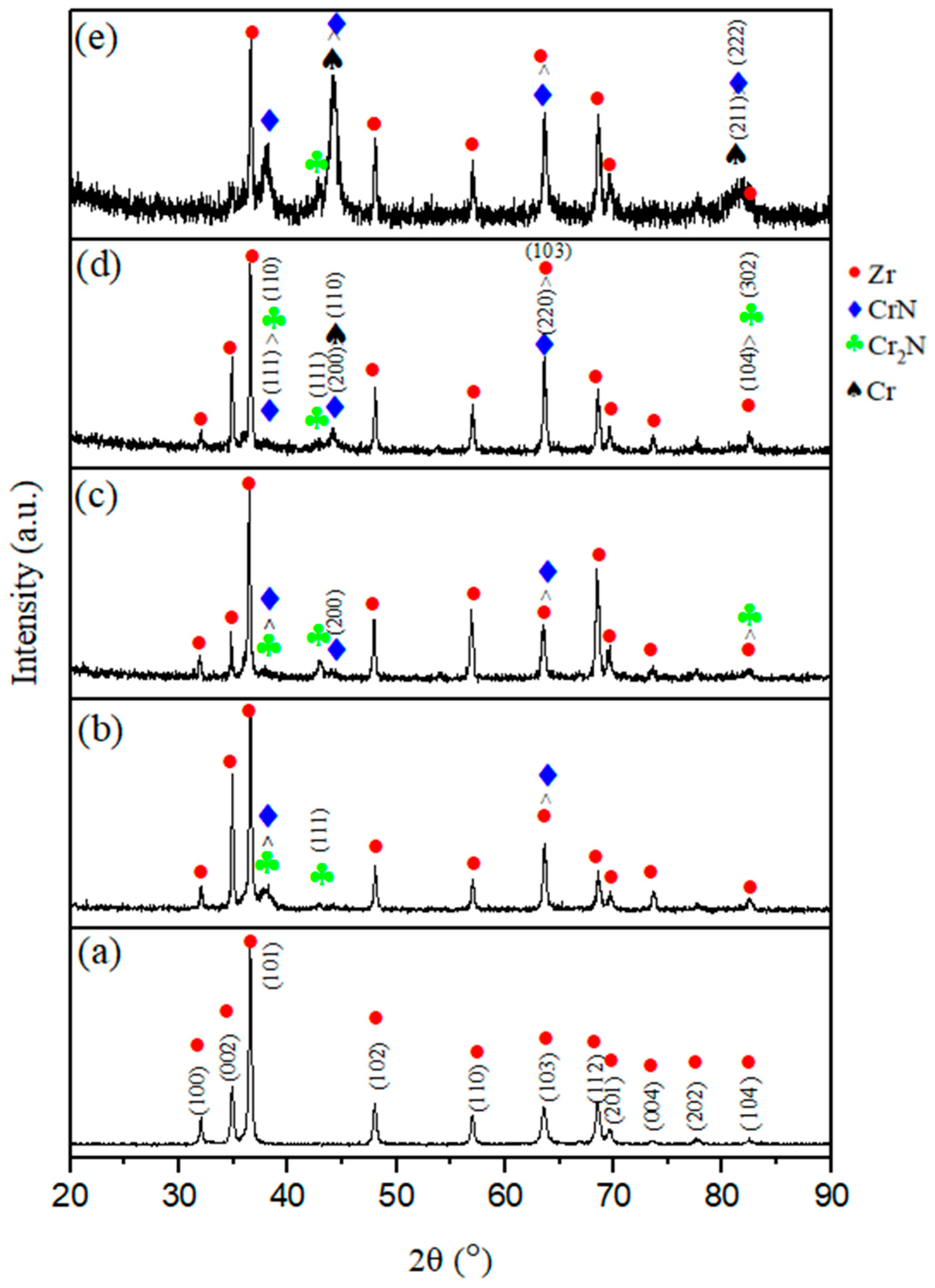 Figure 2 shows the X-ray diffraction (XRD) patterns of the original E110 (Zr-1Nb) substrate and the Cr/CrN coatings produced by magnetron sputtering with different numbers of layers.