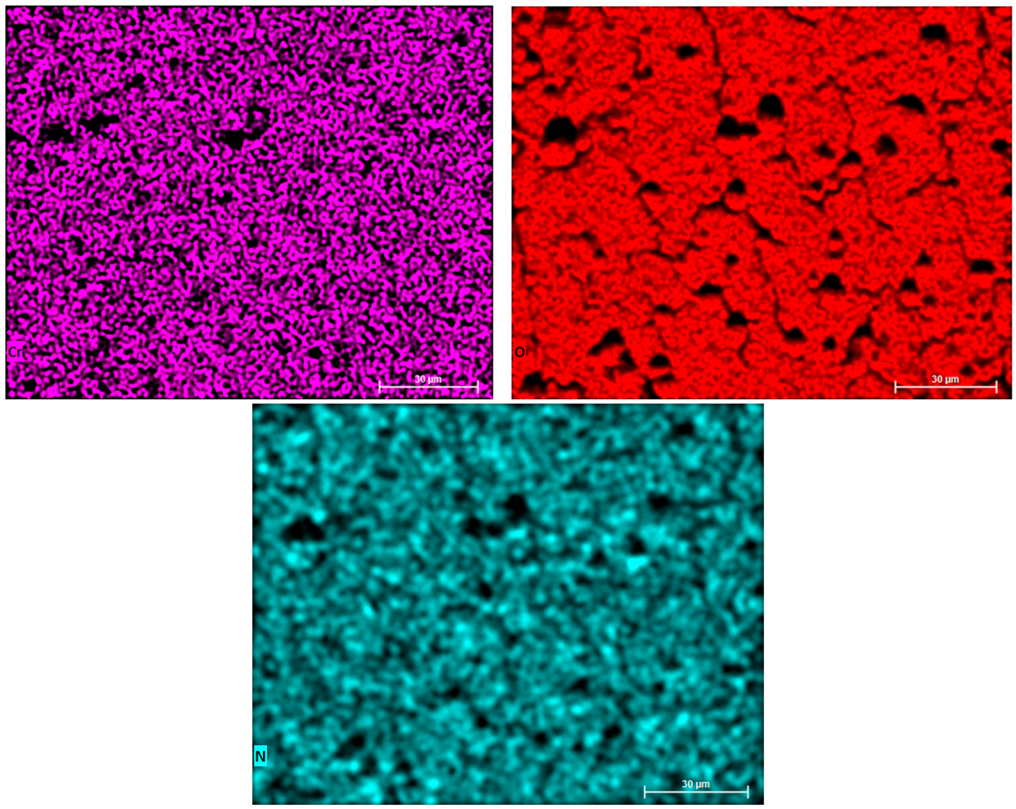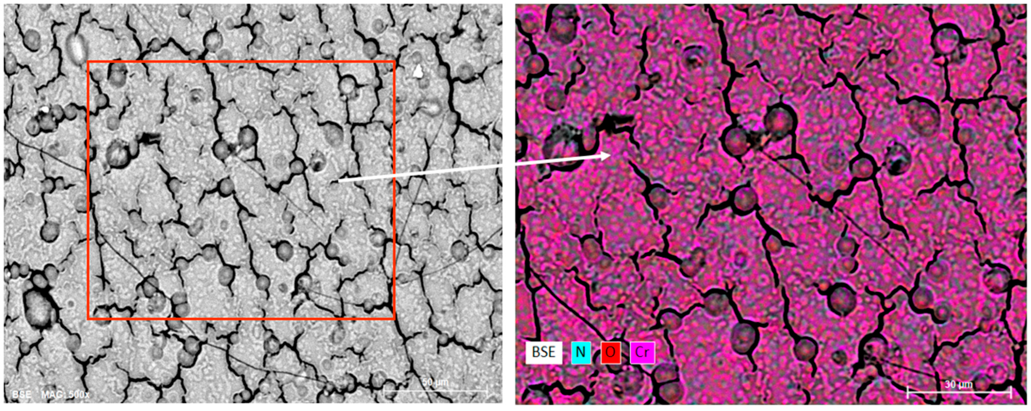 The observed rounded objects represent swellings of the surface oxide layer of Cr2O3, partially exposed in places, and therefore appear as dark pores/craters in the SEM images. EDS mapping shows elevated O content along the rims of these objects with low N content, which is consistent with the model of localized gas accumulation (O2, N2, H2) under the oxide film during HTSO and its subsequent swelling and rupture.